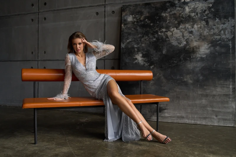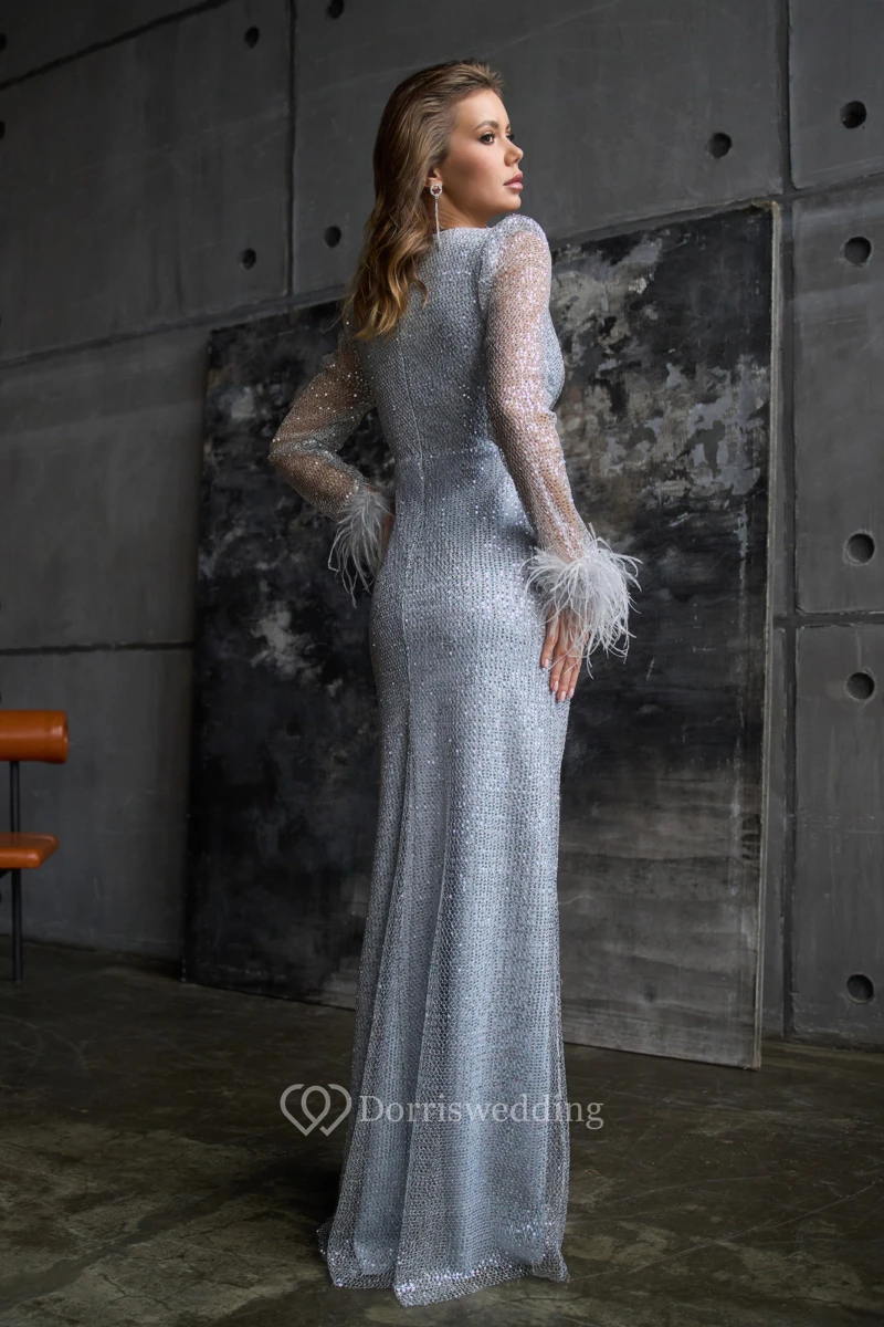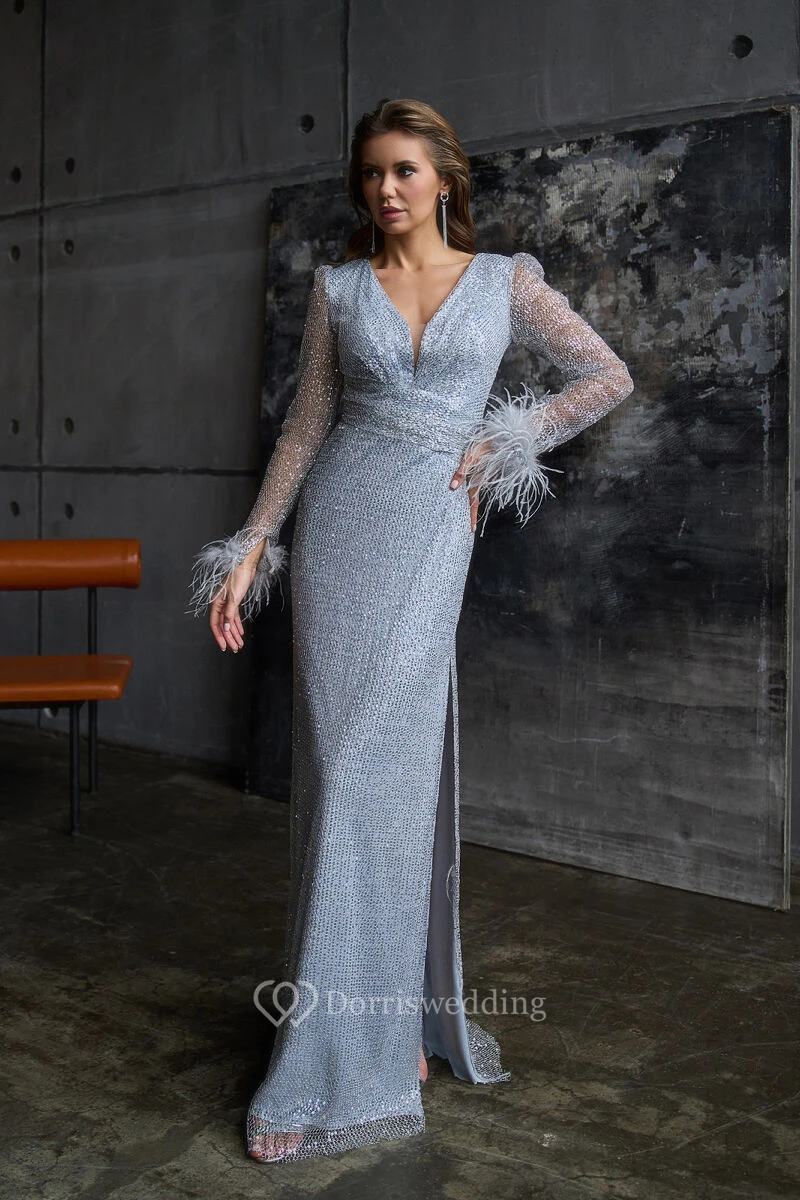 V-neck Long Sleeve Sexy Illusion Sheath Front Split Dress