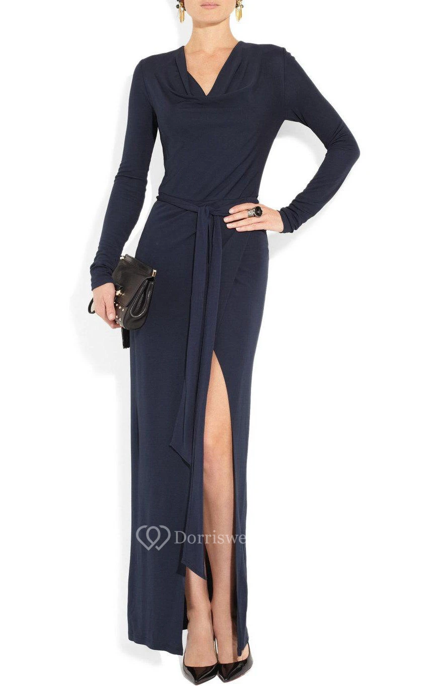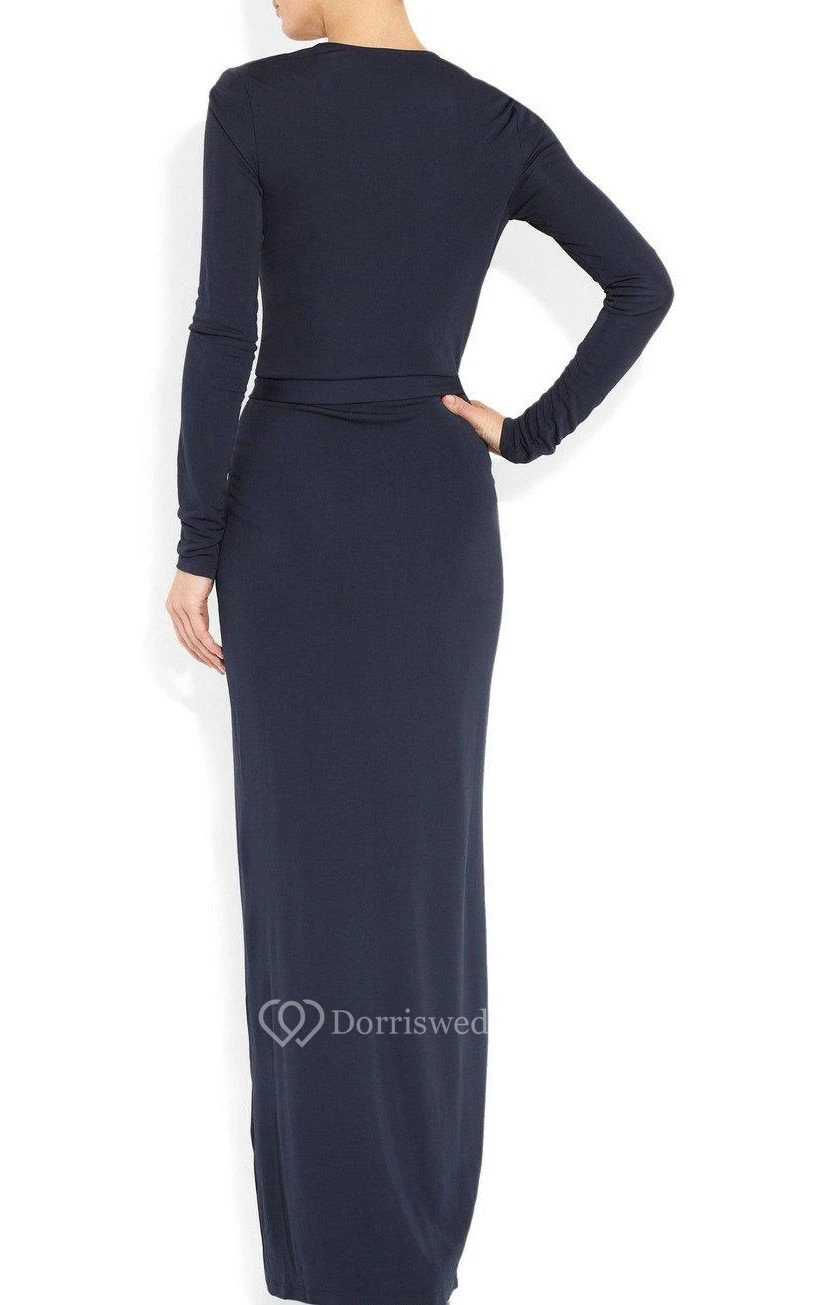 V Neck Long Sleeve Sheath Jersey Long Dress With Sash and Split