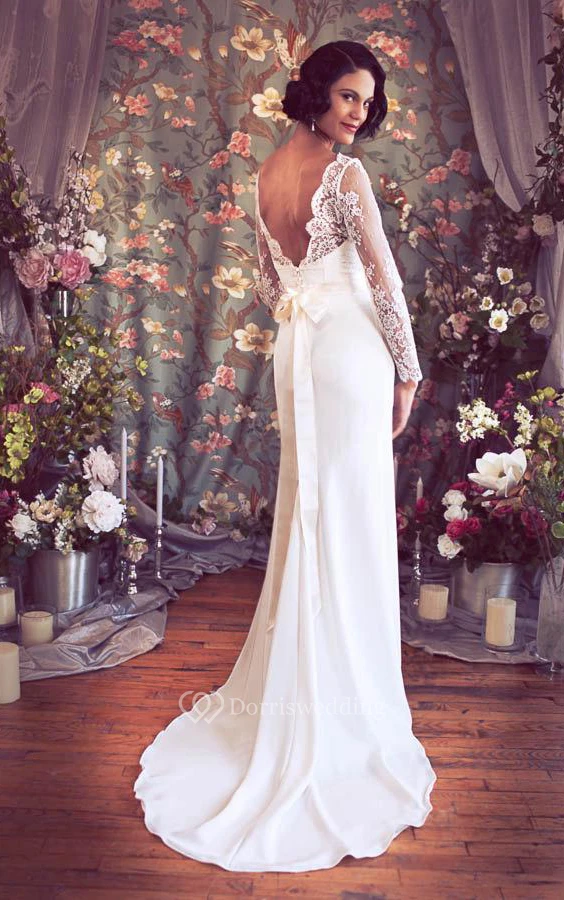 V-Neck Low-V Back Sheath Satin Long Sleeve Wedding Dress With Sash And Flower