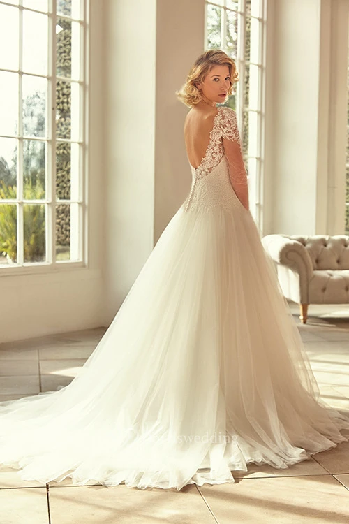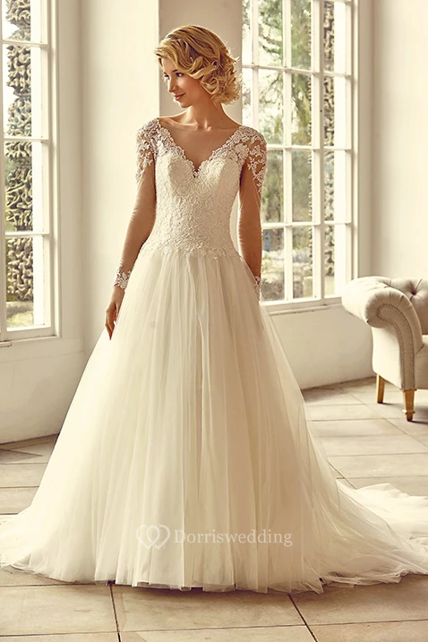 V-Neck Maxi Appliqued Cap-Sleeve Tulle&Lace Wedding Dress