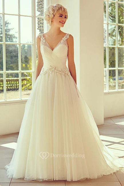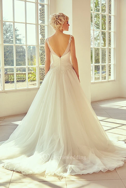 V-Neck Maxi Appliqued Cap-Sleeve Tulle Wedding Dress With Court Train And V Back