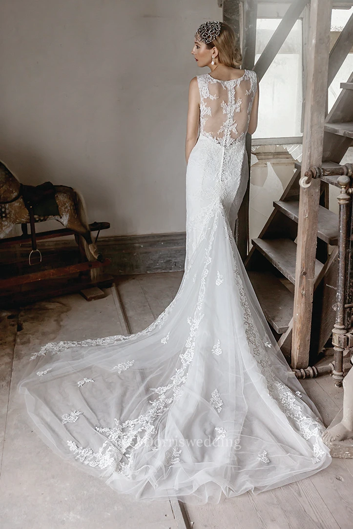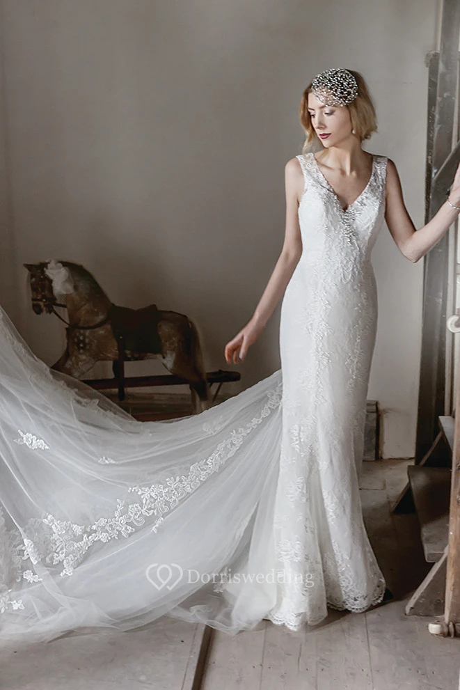 V-Neck Maxi Appliqued Lace Wedding Dress With Chapel Train And Illusion