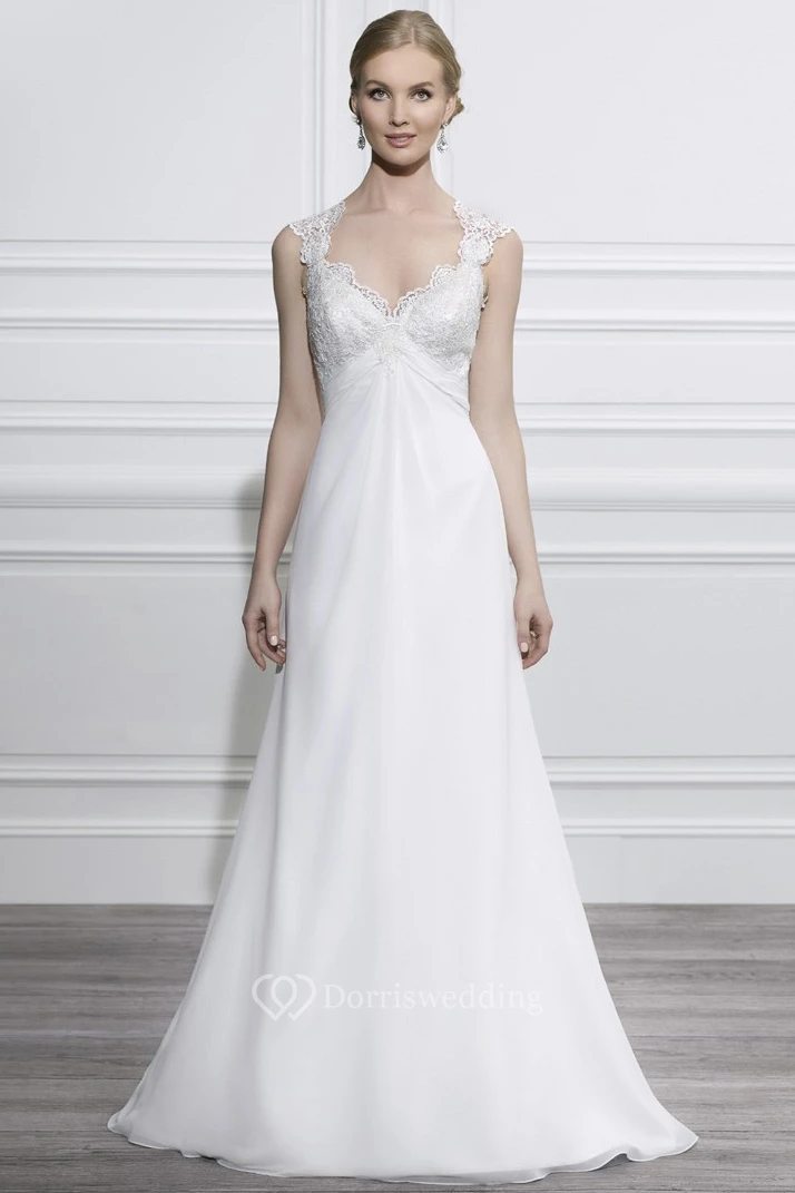 V-Neck Maxi Cap-Sleeve Appliqued Chiffon Wedding Dress With Court Train And V Back
