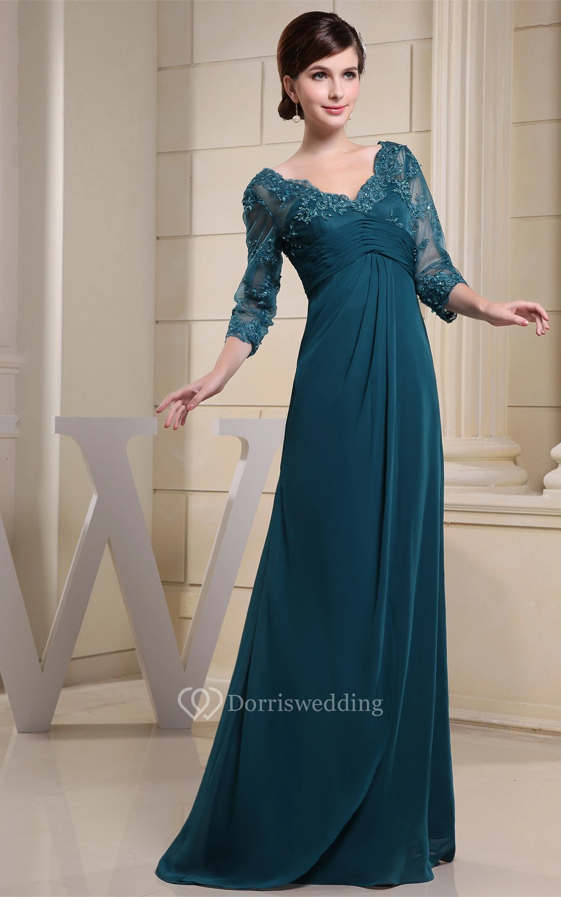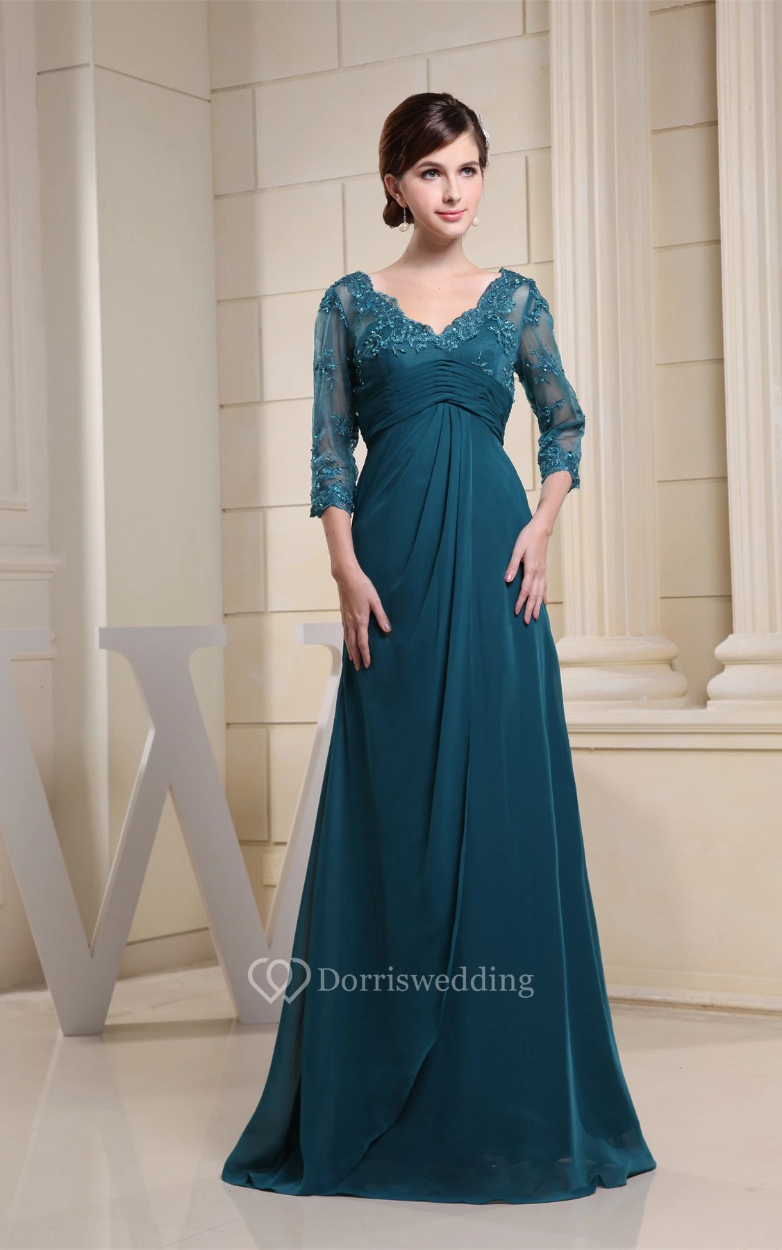 V-Neck Maxi Empire Illusion Sleeve and Dress With Appliques