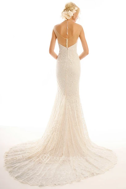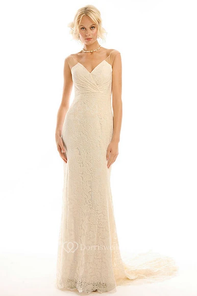 V-Neck Maxi Lace Wedding Dress With Court Train And V Back