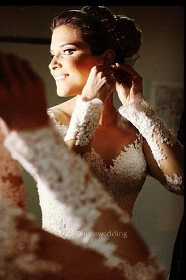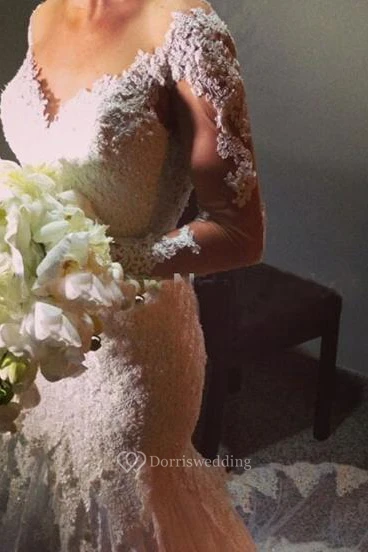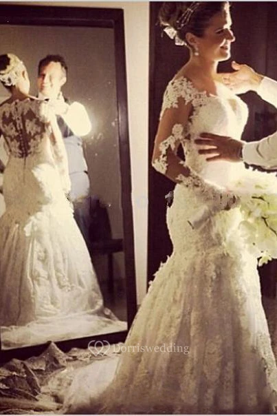 V Neck Mermaid Lace Gown With Illusion Long Sleeves
