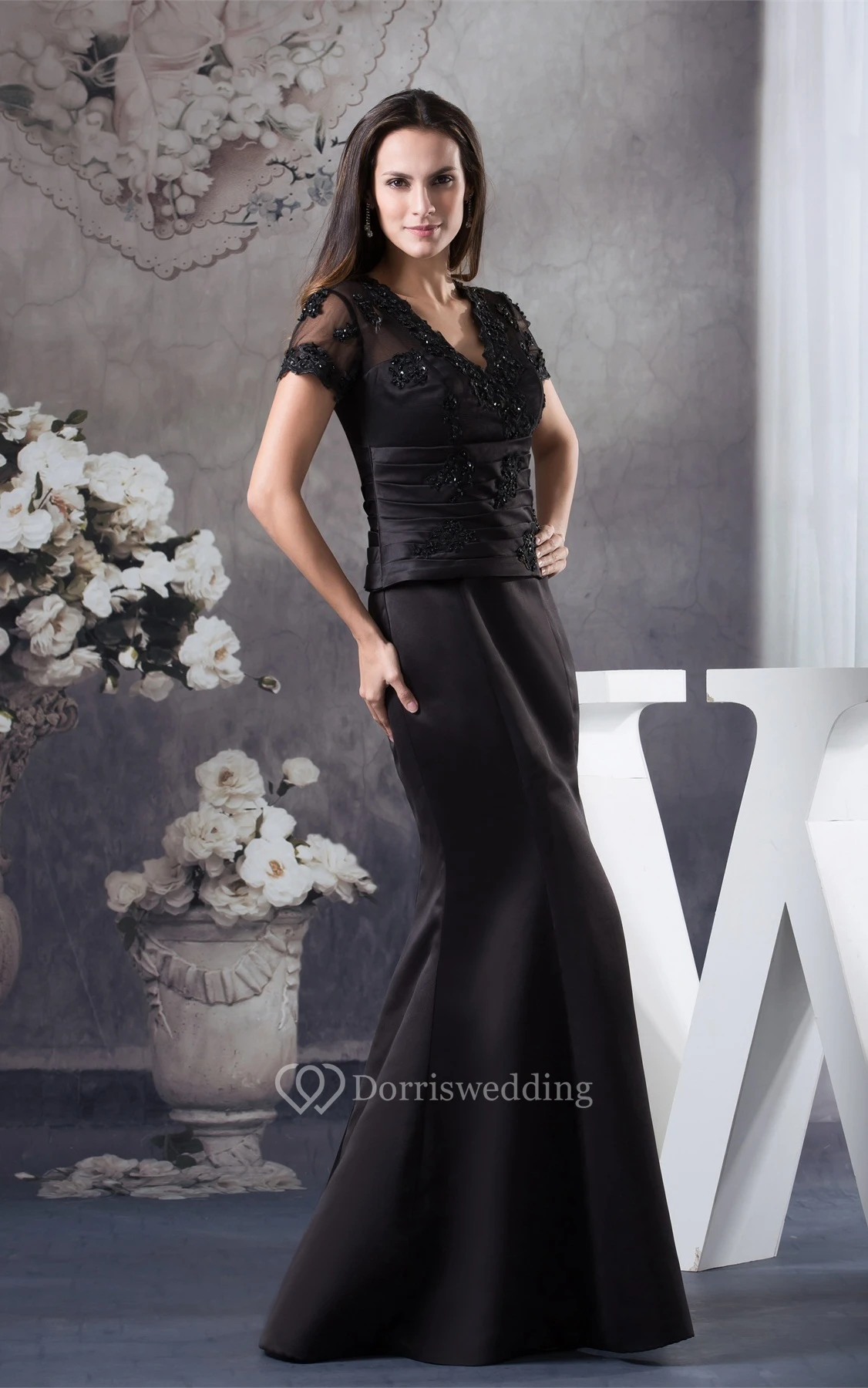 V-Neck Mermaid Satin Mini-Sleeve Illusion and Dress With Appliques