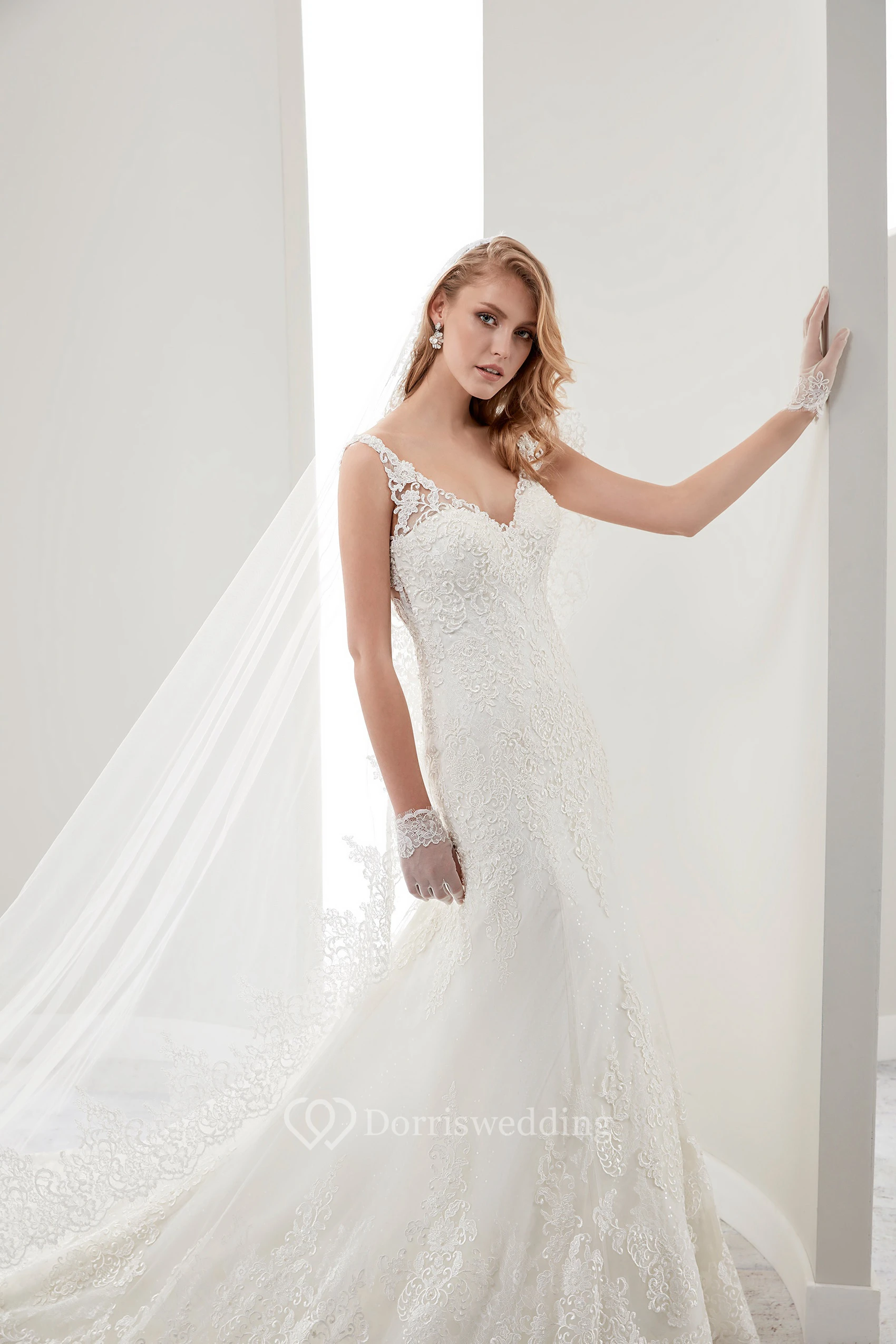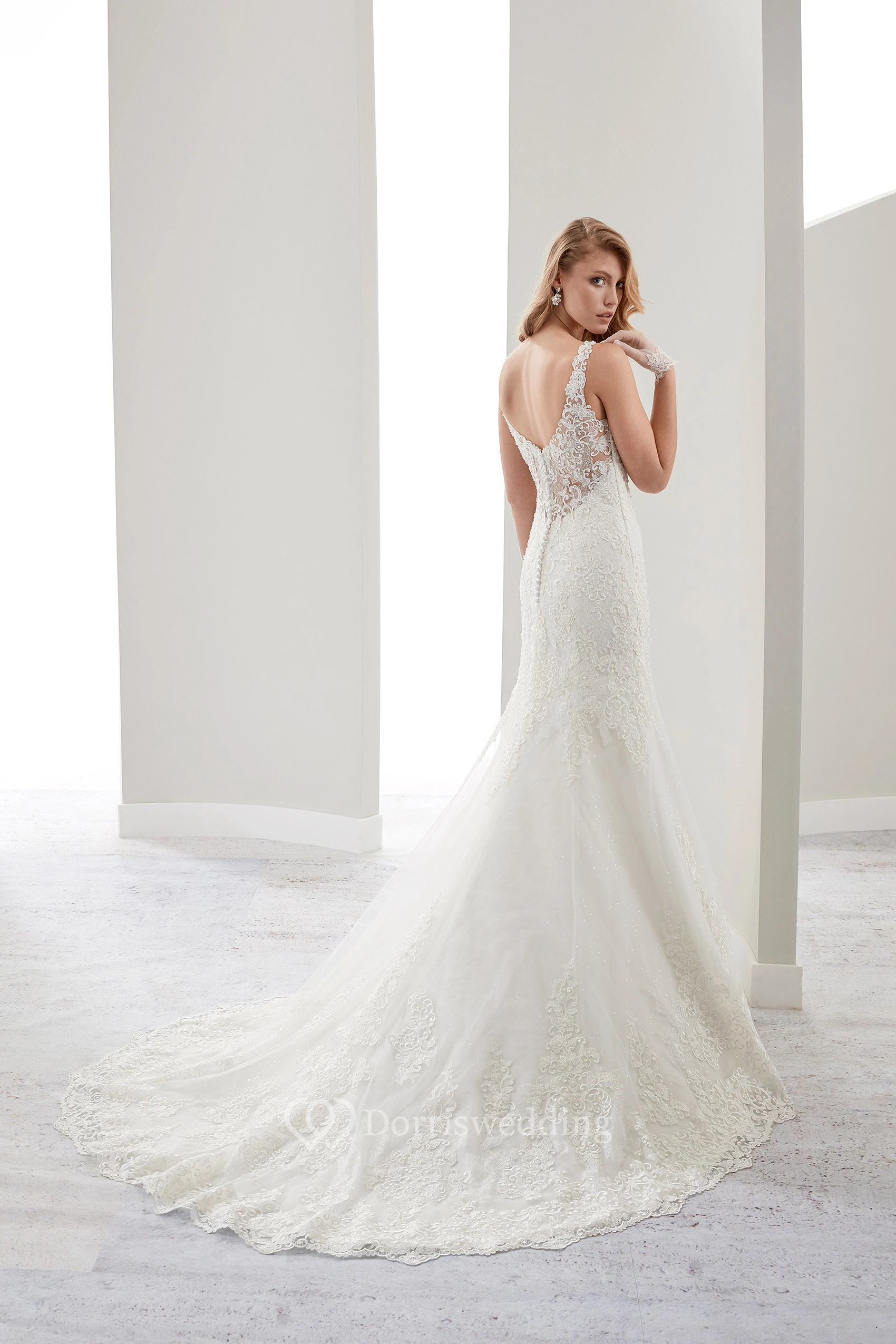V-Neck Mermaid Sheath Lace Bridal Gown With Illusive Appliques Straps And Open Back