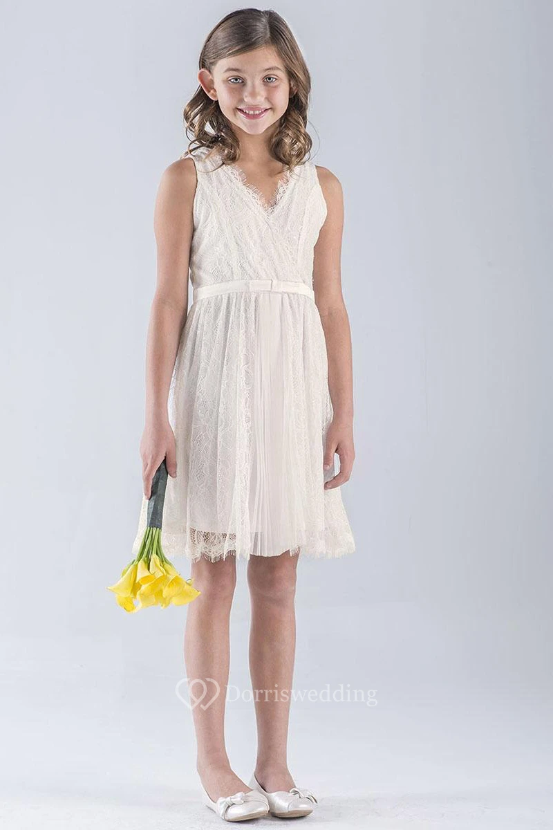 V-Neck Midi Pleated Empire Tulle&Lace Flower Girl Dress