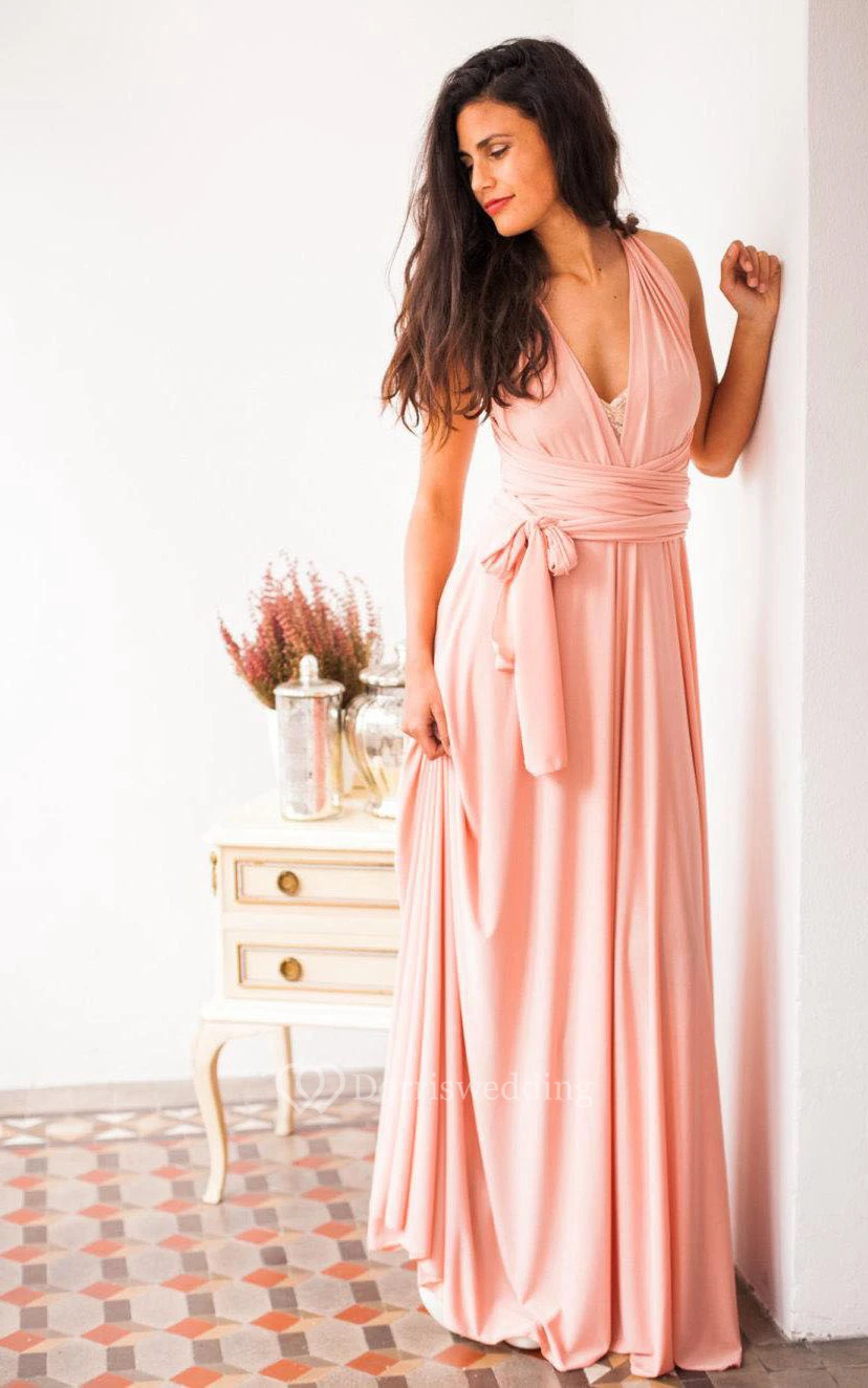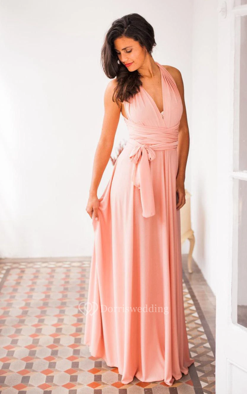 V Neck Pleated A-line Chiffon Long Dress With Sash
