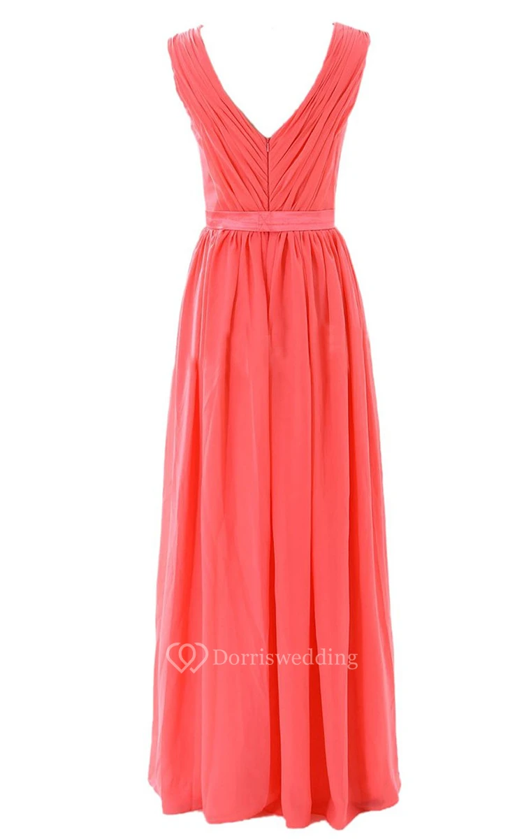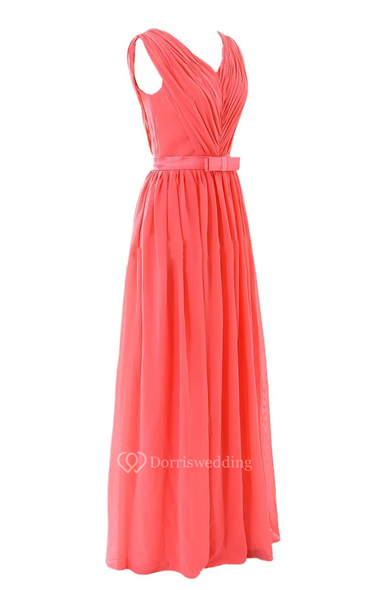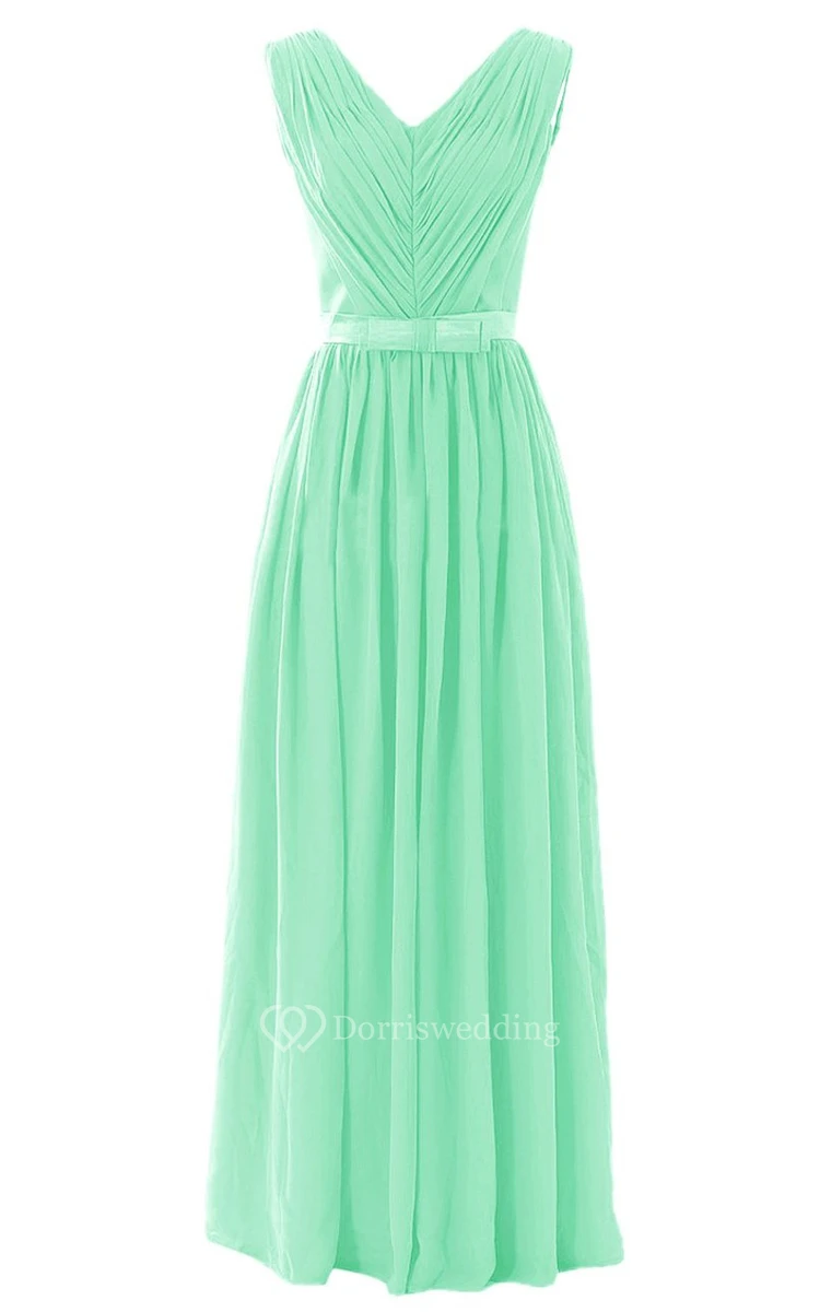 V-neck Pleated Chiffon A-line Gown With Bow