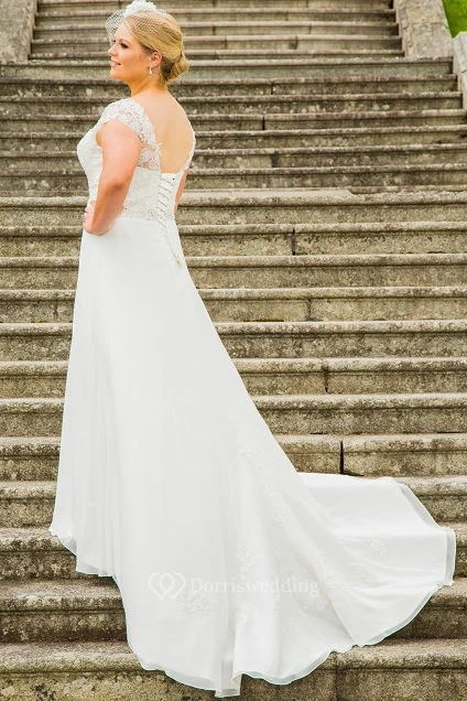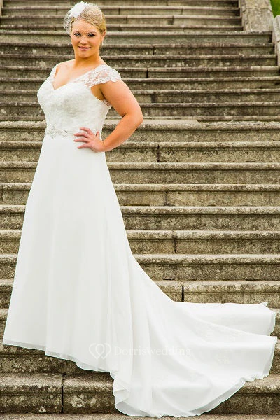 V Neck Plus Size Lace Cap Sleeve Bridal Gown With Lace Up