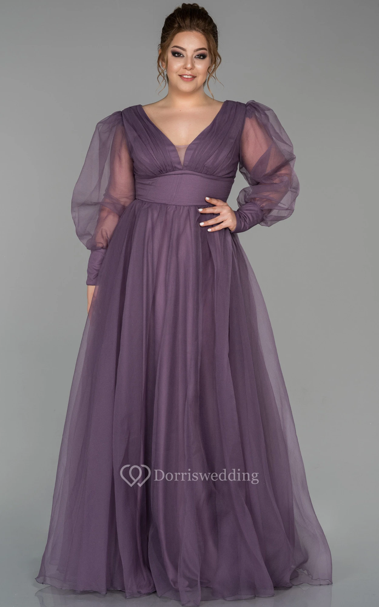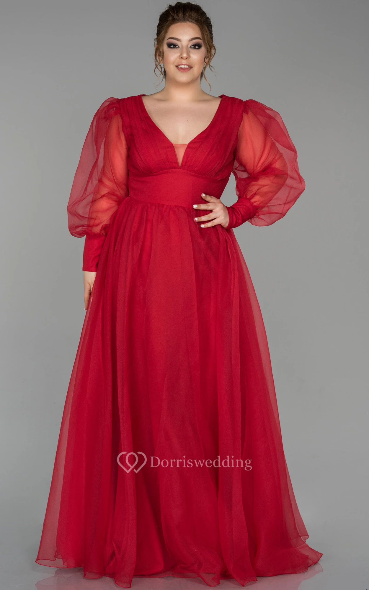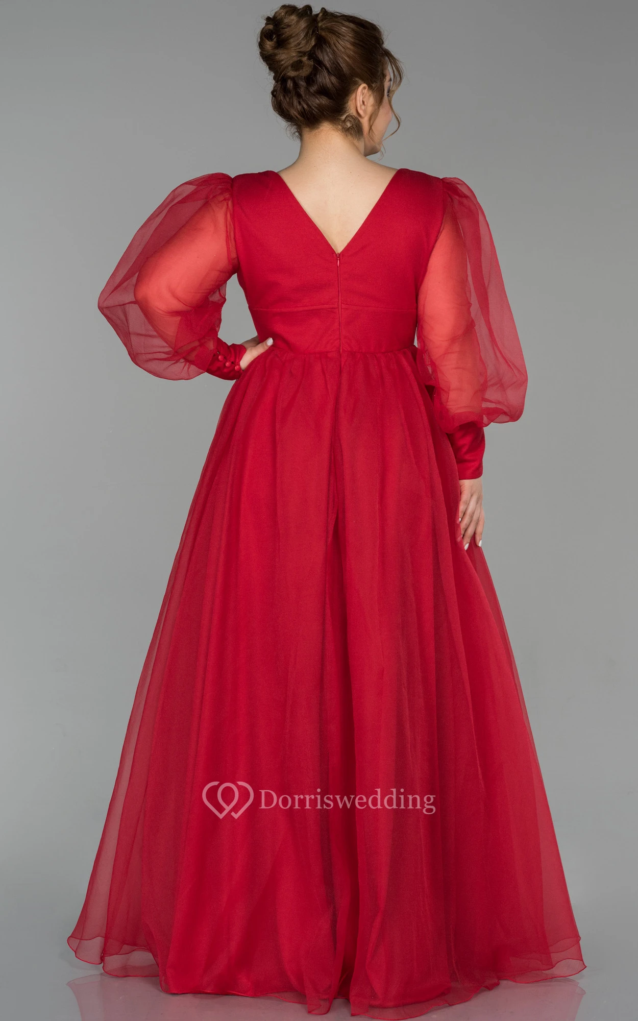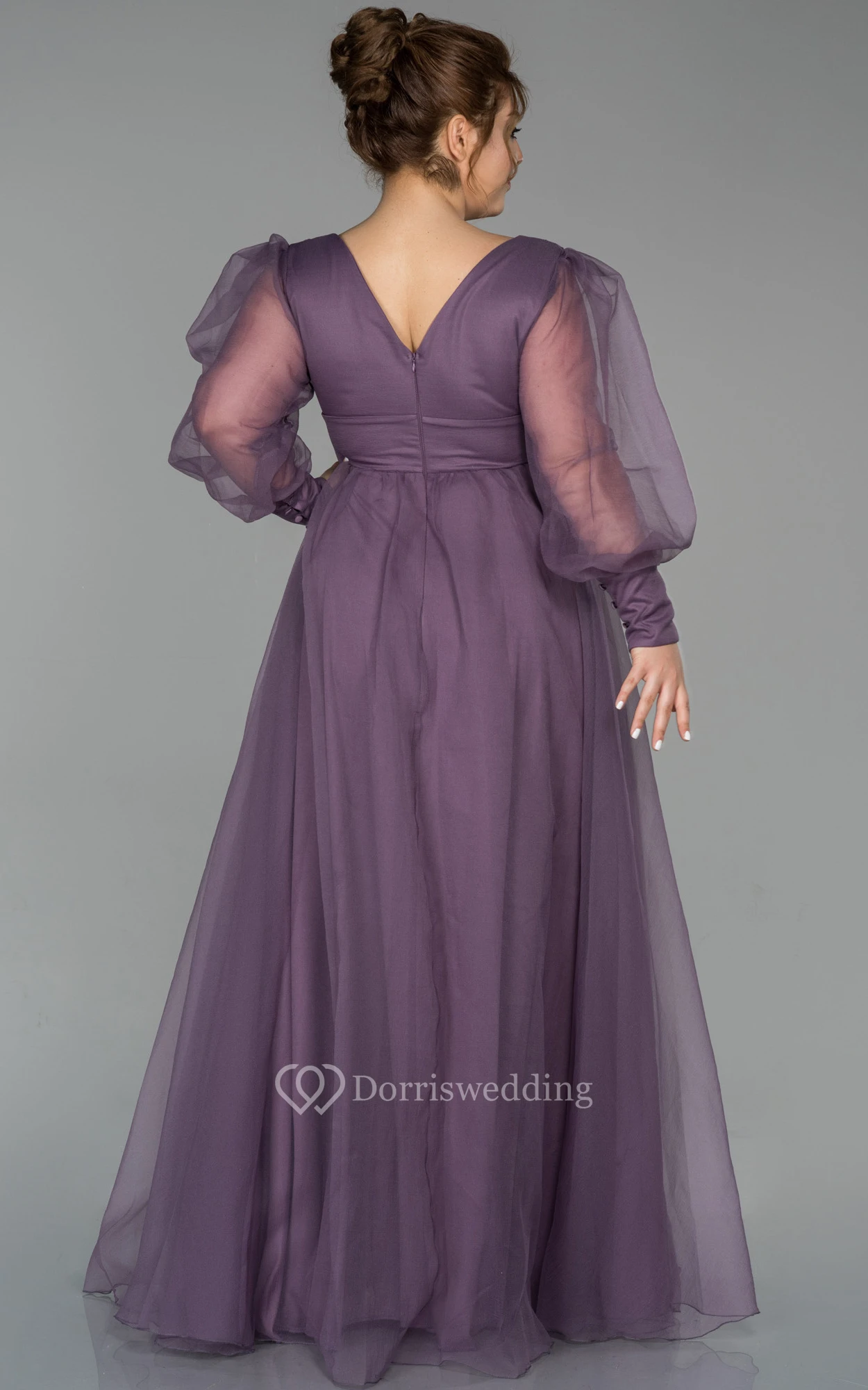 V-neck Puff-sleeve Pleated Empire A-line Evening Plus Size Dress with V Back