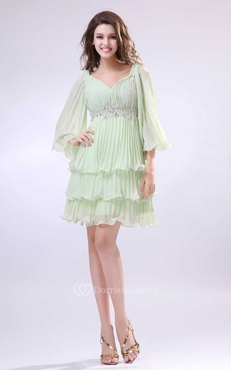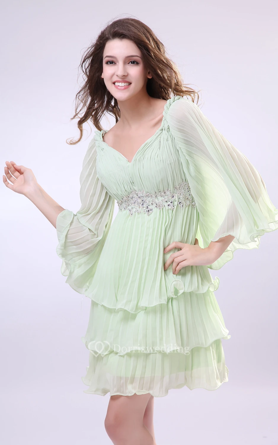 V-Neck Puff Sleeve Short Dress With Pleating and Beading