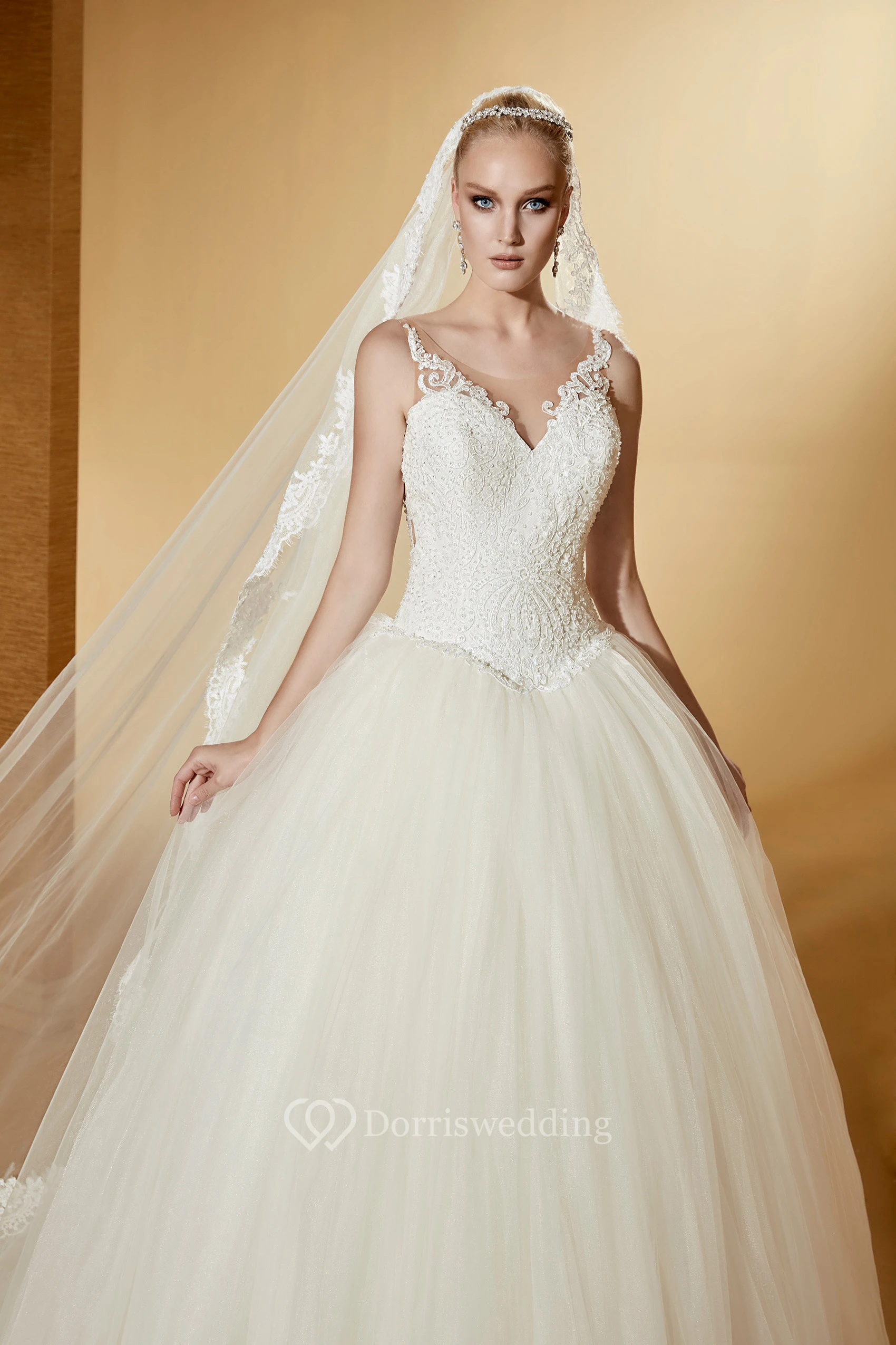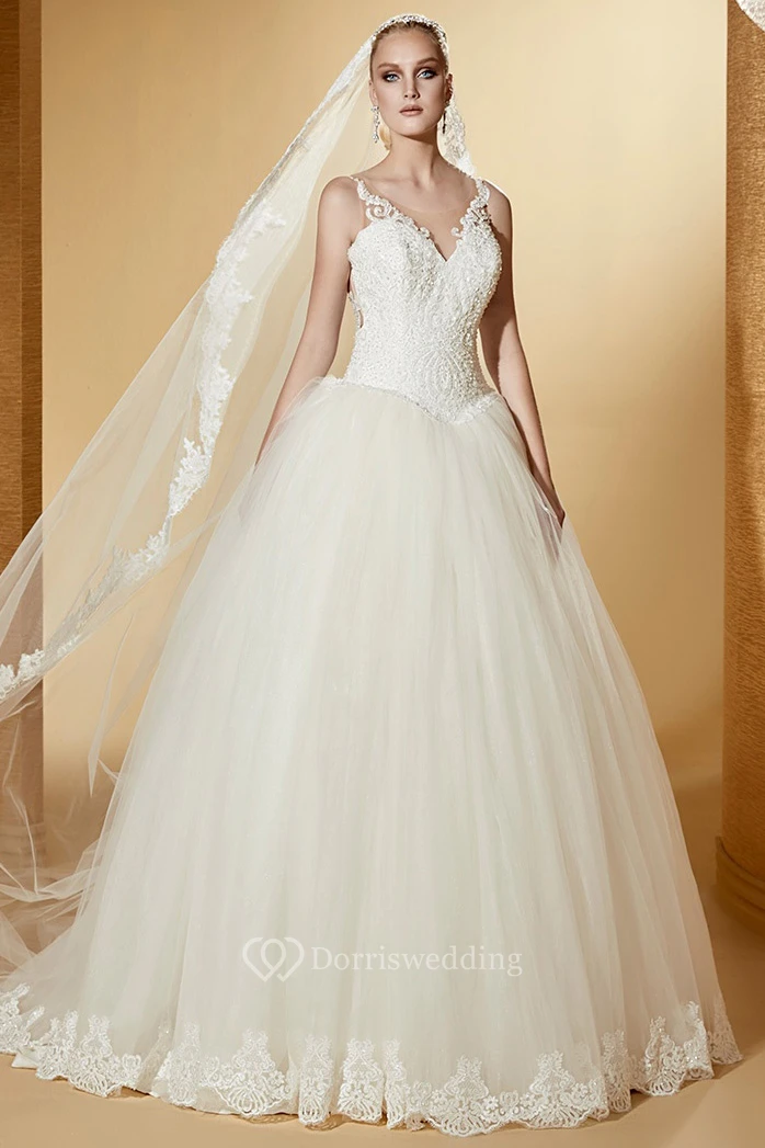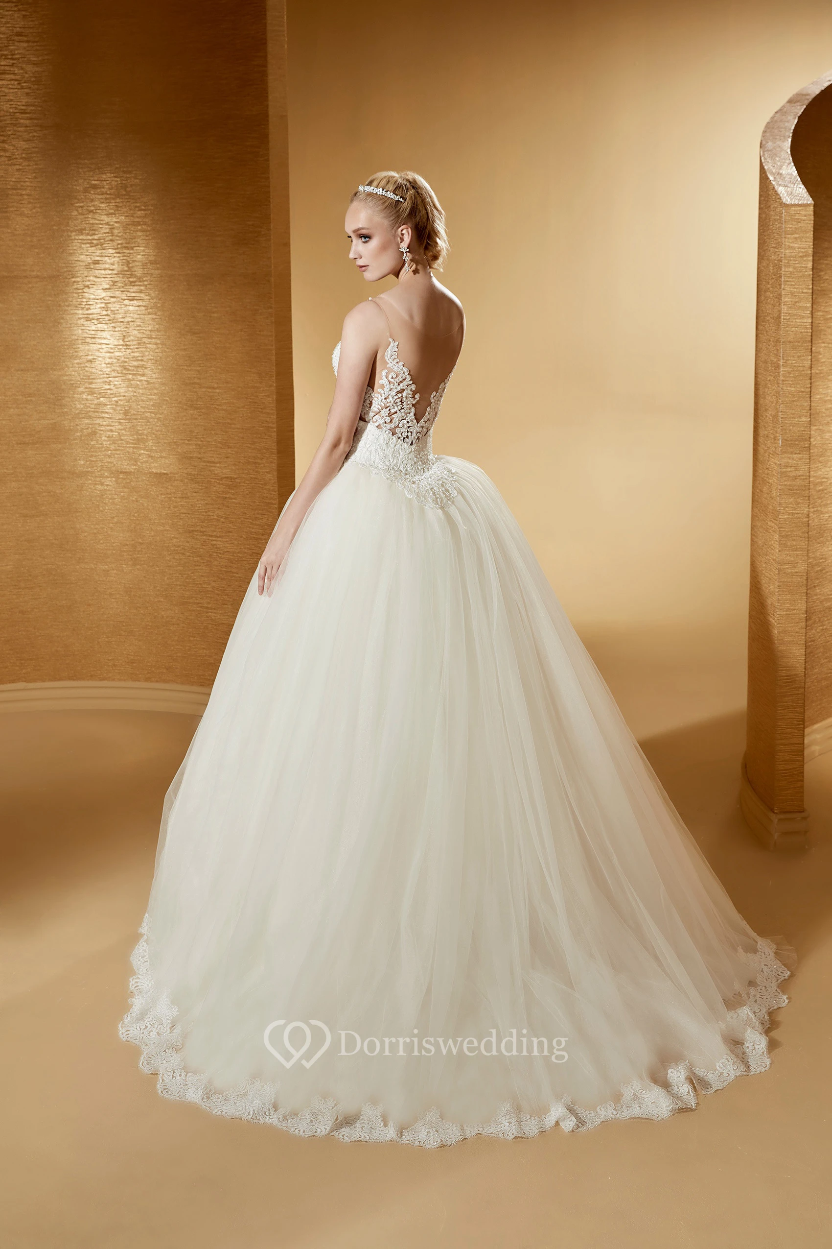 V-neck Puffy Wedding Gown with Lace Corset and Open Back