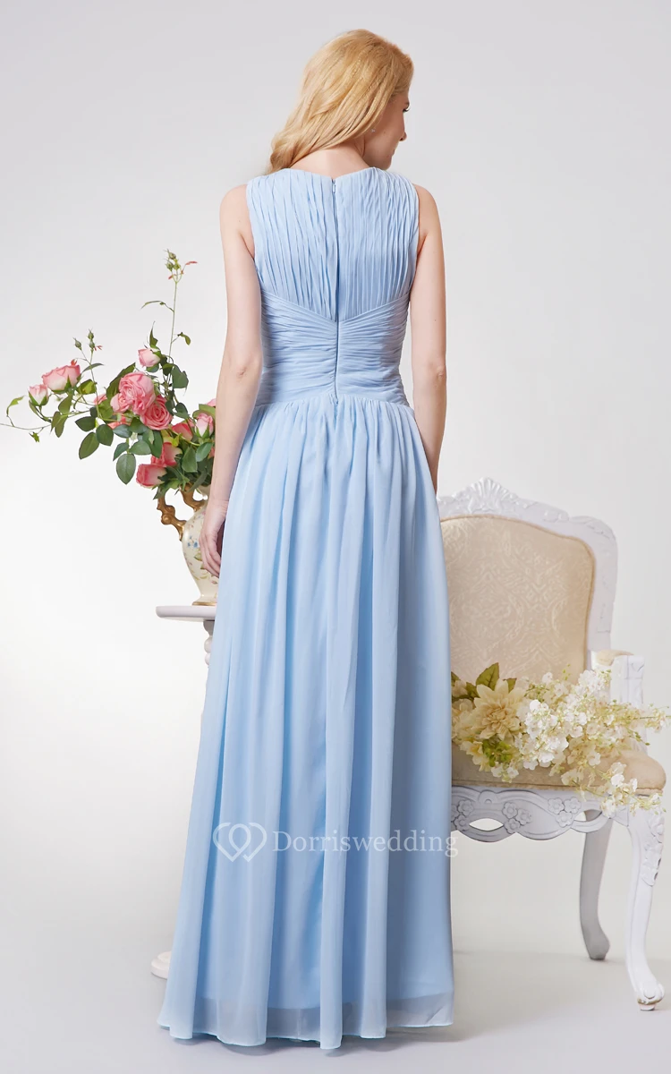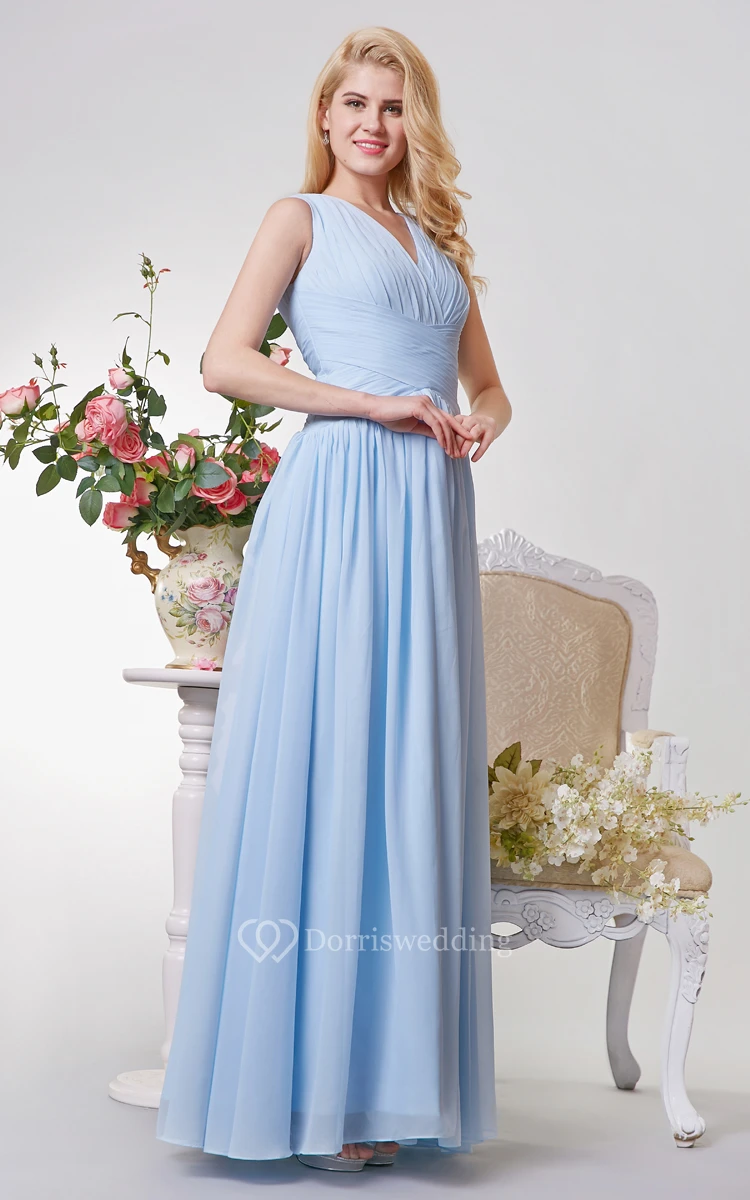 V-neck Ruched and Pleated A-line Long Chiffon Dress