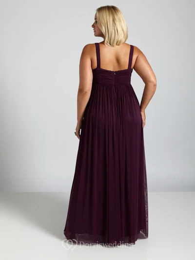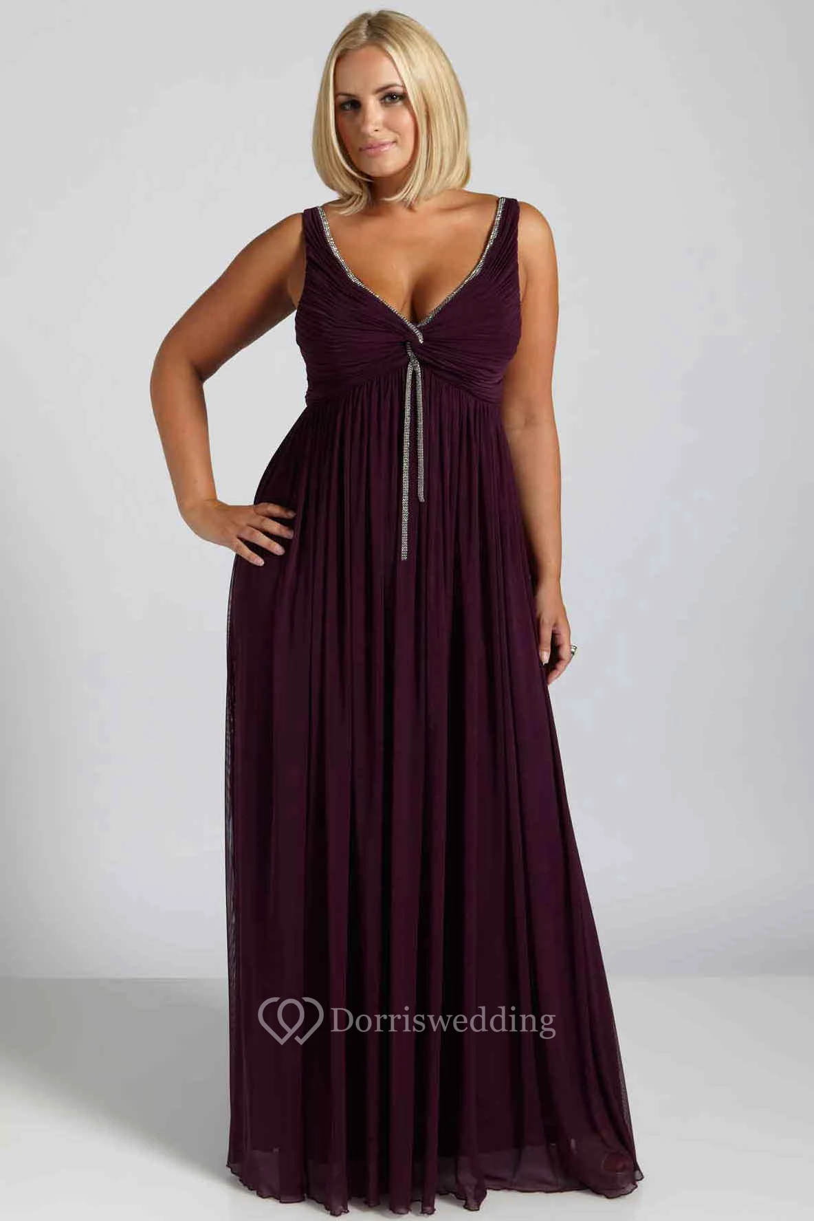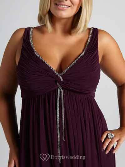 V-Neck Ruched Sleeveless Floor-Length Empire Chiffon Plus Size Prom Dress With Pleats And Beading