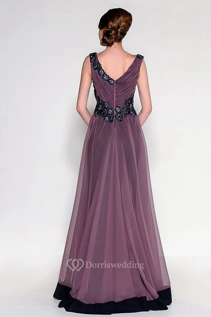 V-Neck Ruched Sleeveless Floor-Length Satin&Tulle Prom Dress With Beading