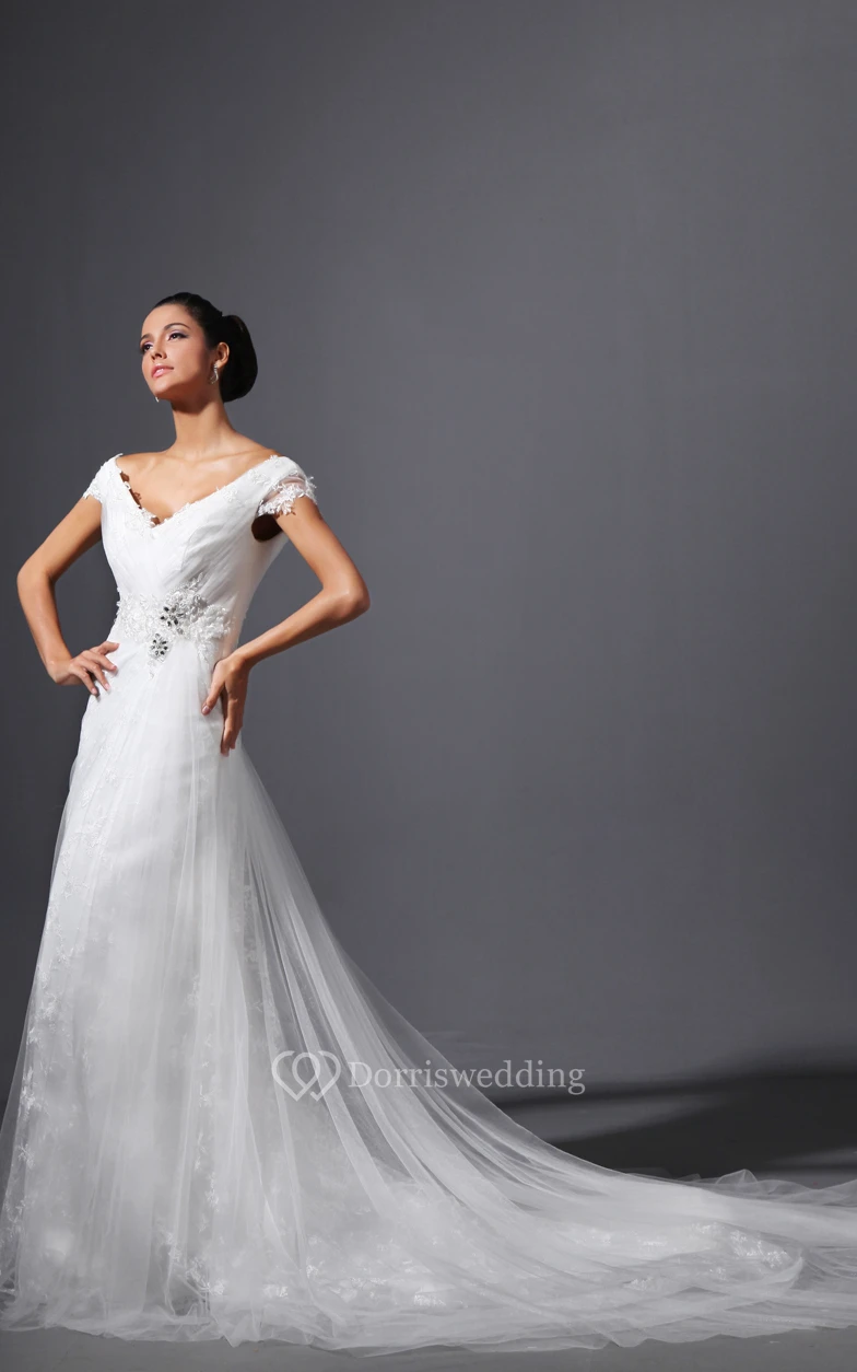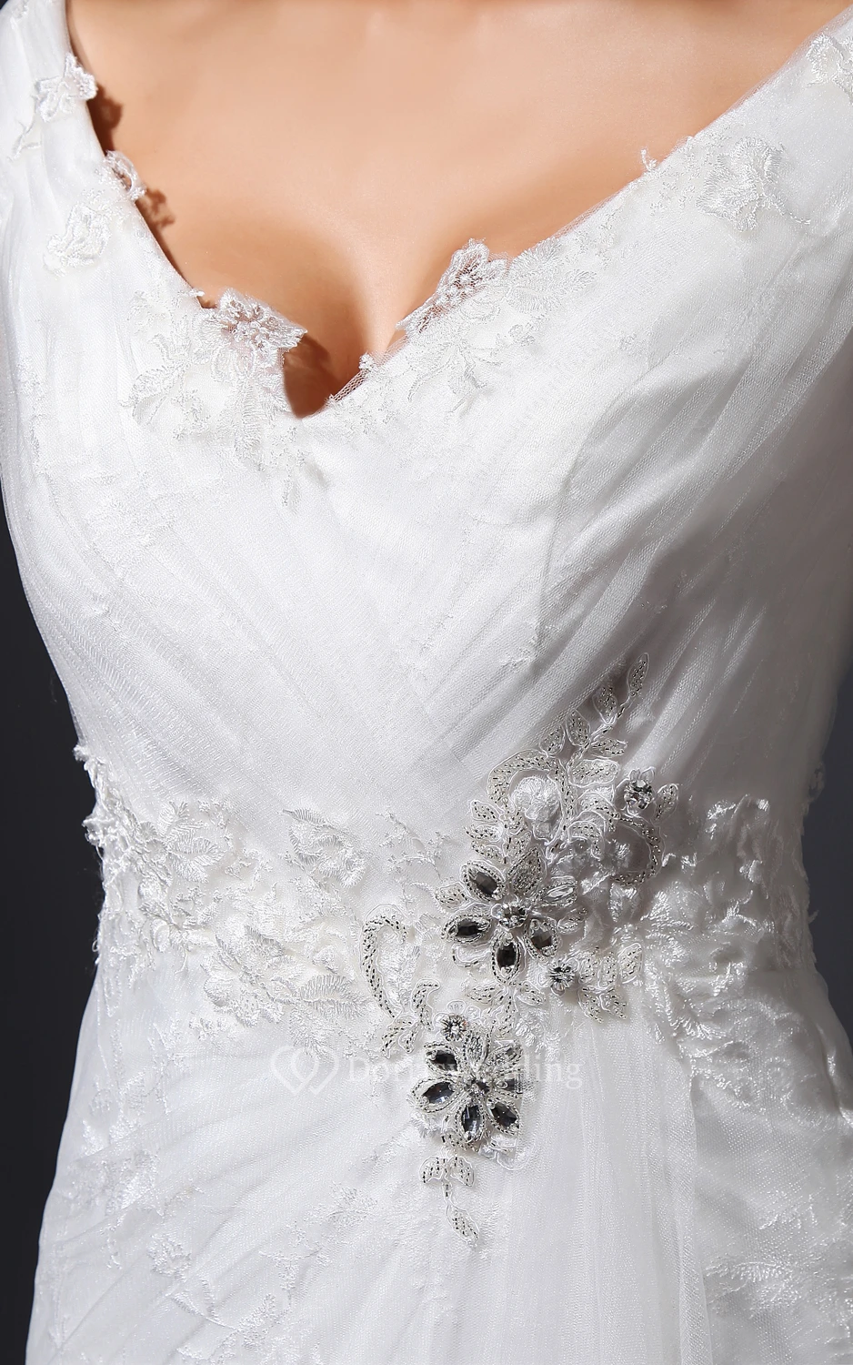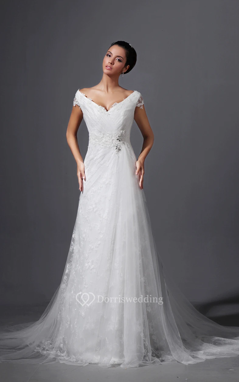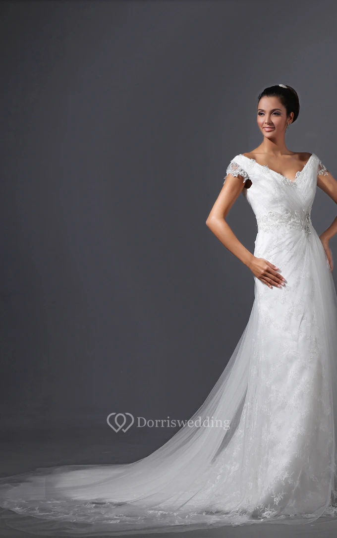 V-Neck Ruching Sheath Dress With Lace Appliques Tulle Overlay