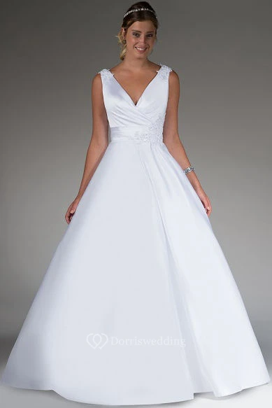 V Neck Satin Bridal Ball Gown With Appliqued Straps And Waist