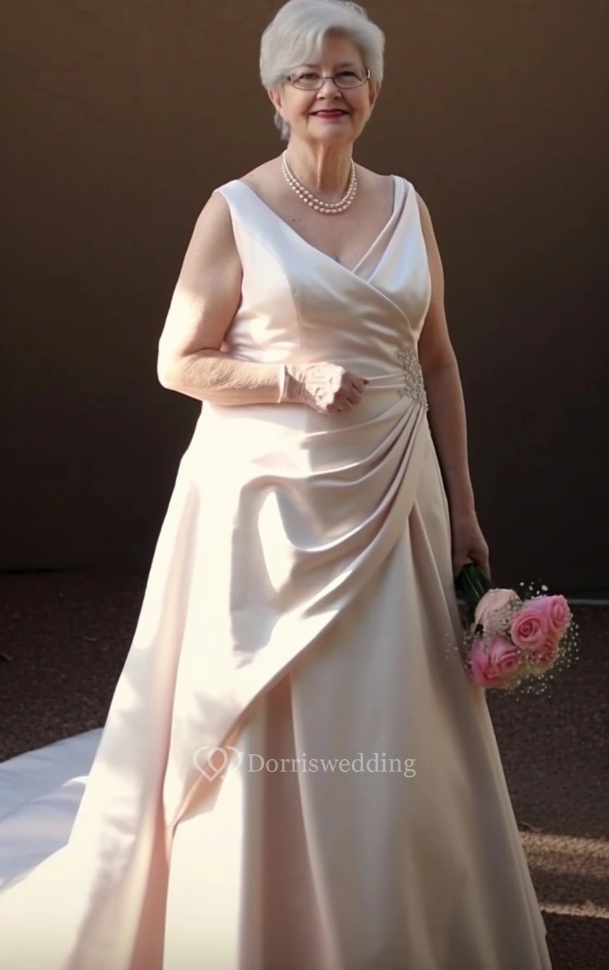 V-neck Satin Sleeveless Side-Draped A-line Ball Gown Wedding Dress