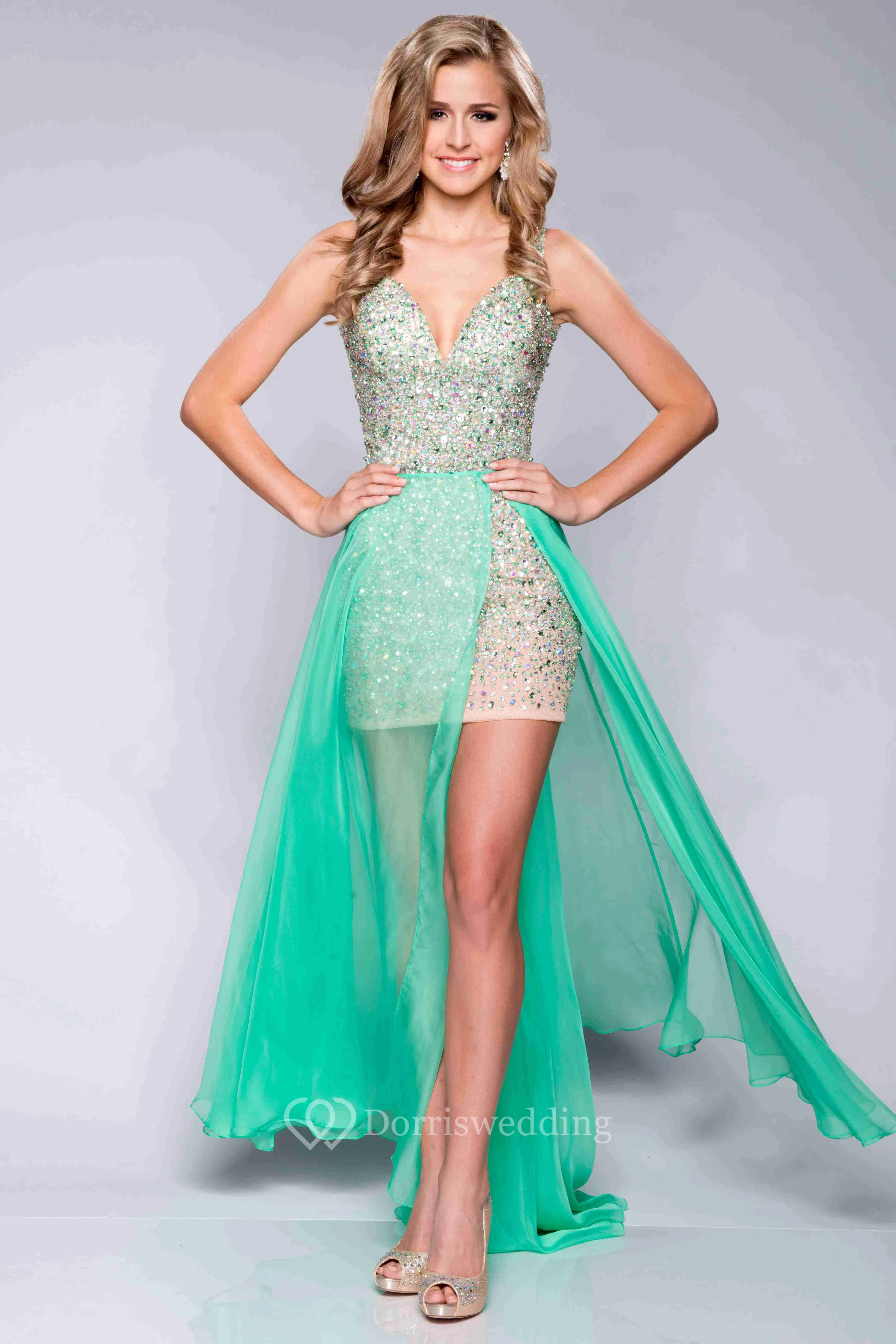 V-Neck Sequined Sheath Short Prom Dress Featuring Skirt Chiffon Overlay