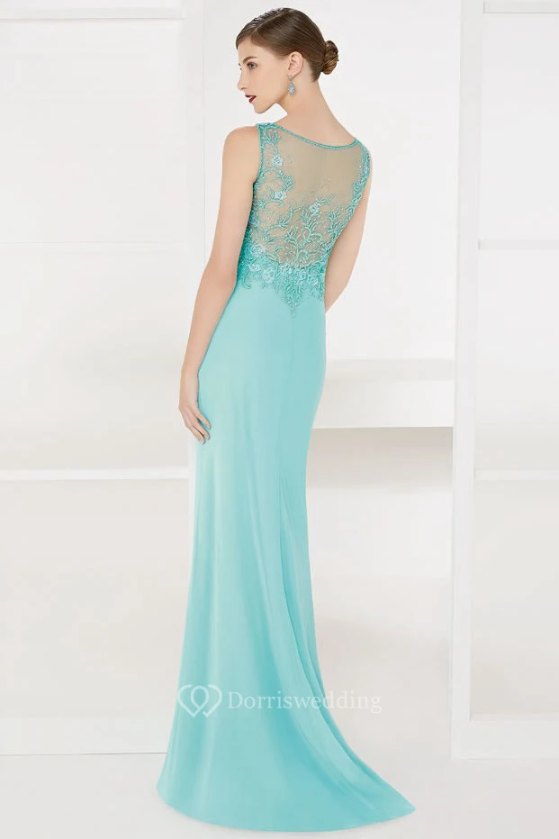 V Neck Sheath Appliqued Empire Waist Long Prom Dress With Illusion Back