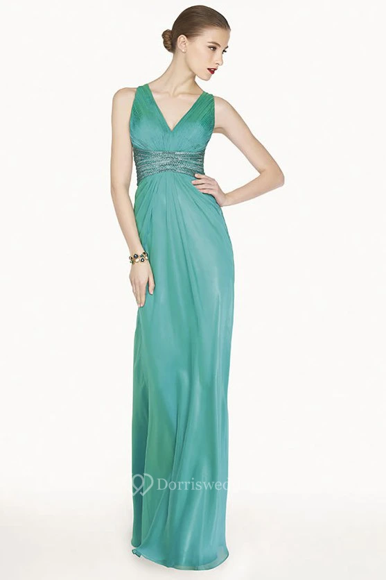 V Neck Sheath Chiffon Long Prom Dress With Back Crystal Criss Cross Straps