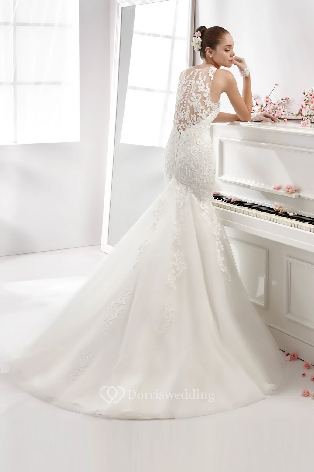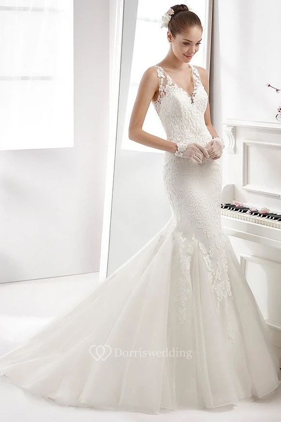 V-neck Sheath Mermaid Lace Wedding Gown with Illusive Lace Straps and Brush Train