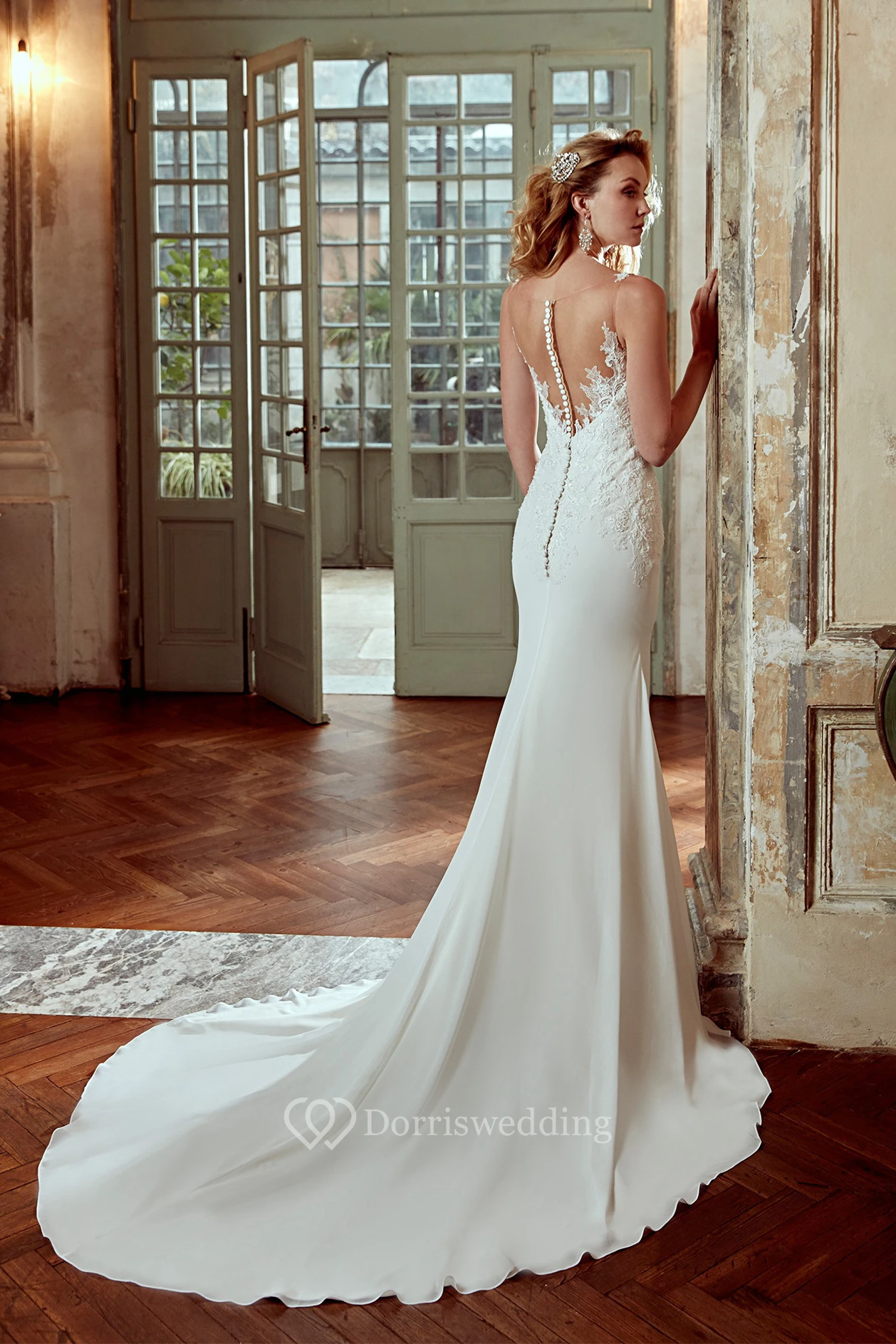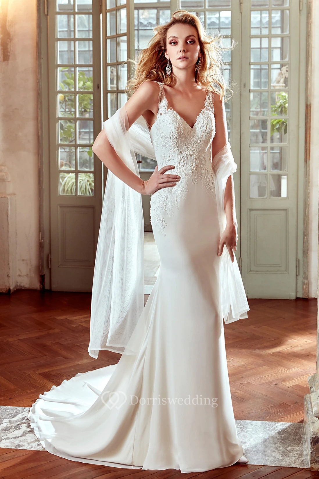 V-Neck Sheath Wedding Dress with Lace Floral Straps and Brush Train