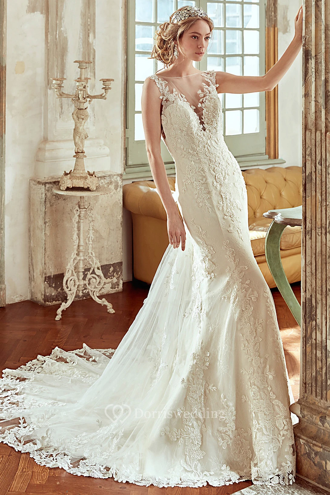 V-Neck Sheath Wedding Dress with Lace Floral Straps and Open Back