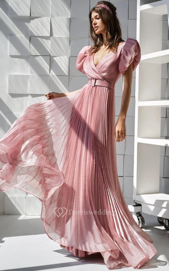V-neck Short Puff-sleeve Sheath Dress with Belt and Pleated Skirt
