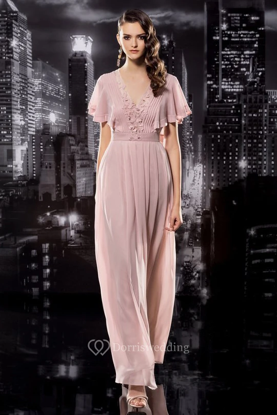 V-Neck Short Sleeve Chiffon Illusion Dress With Appliques And Pleats