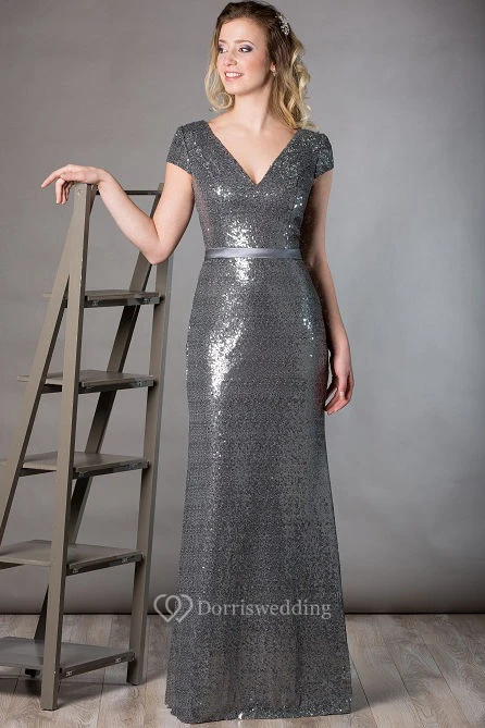 V Neck Short Sleeve Sheath Sequin Long Mother Of The Bride Dress With Satin Sash