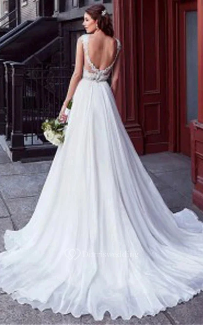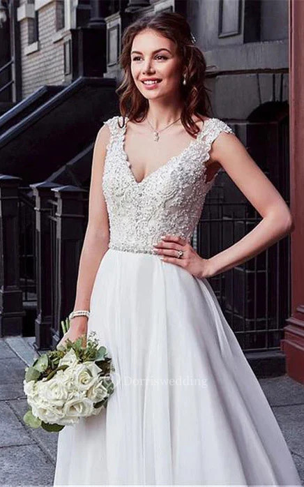 V-neck Sleeveless A-line Ball Gown Wedding Dress with Beaded Top