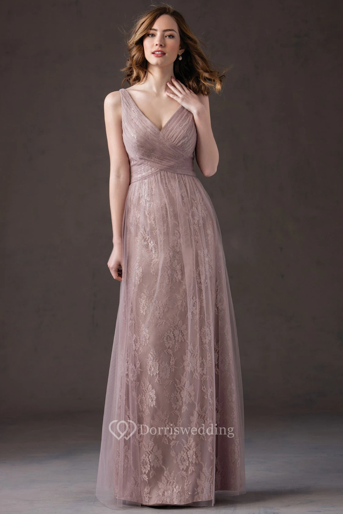 V-Neck Sleeveless A-Line Bridesmaid Dress With Tulle Overlay And Pleats