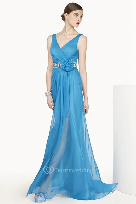 V Neck Sleeveless A-line Chiffon Long Dress With Crystal Flower Waist
