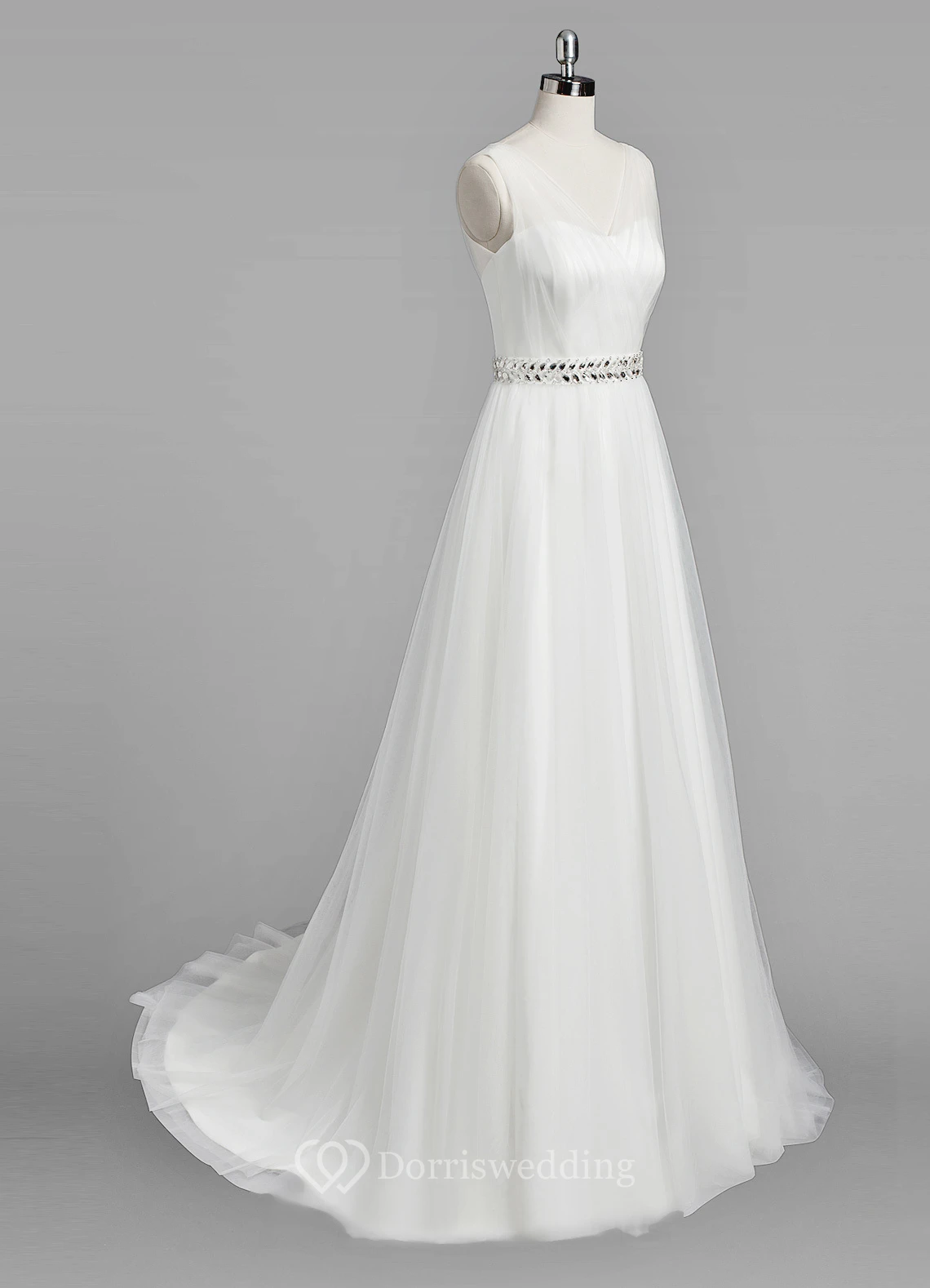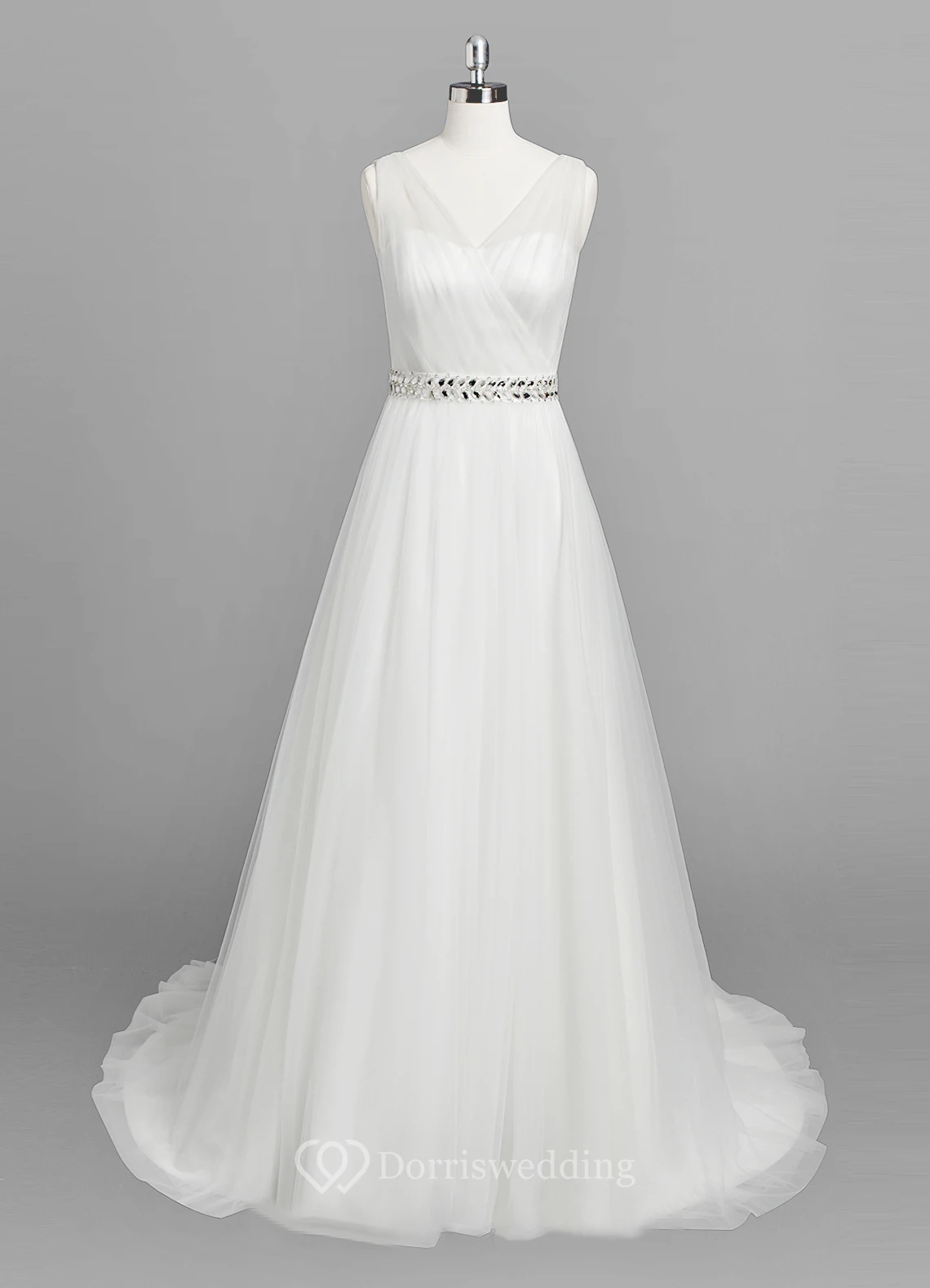 V-neck Sleeveless A-line Tulle Wedding Dress With Beaded Waist