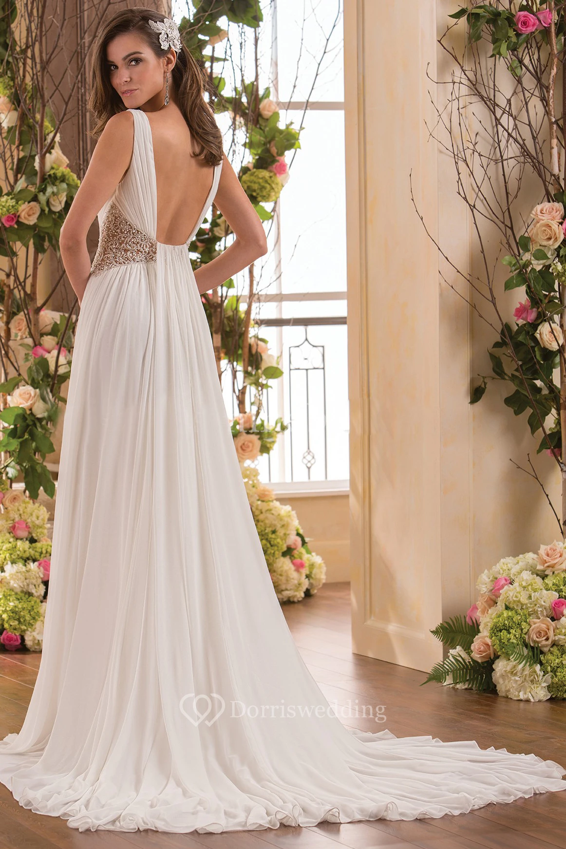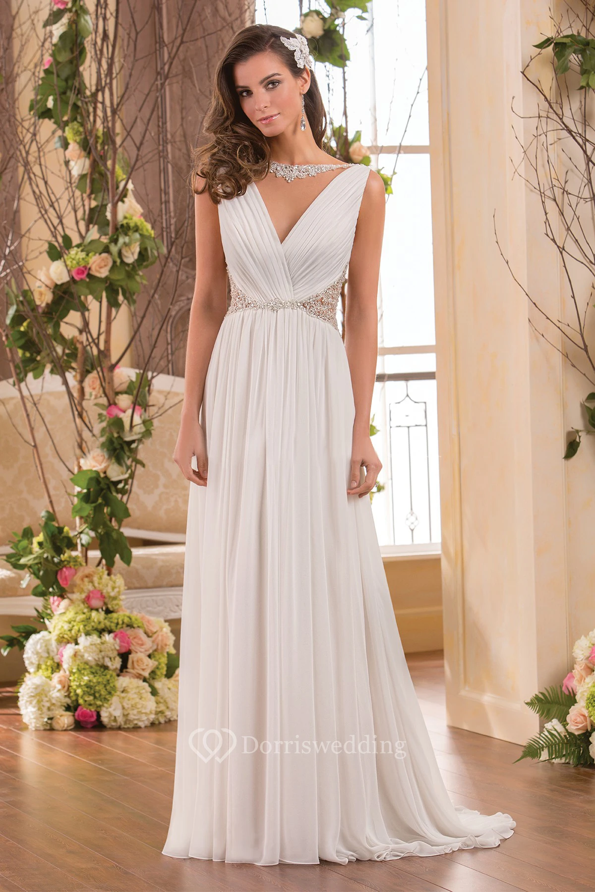 V-Neck Sleeveless Chiffon Wedding Dress With Beaded Waist And Pleats
