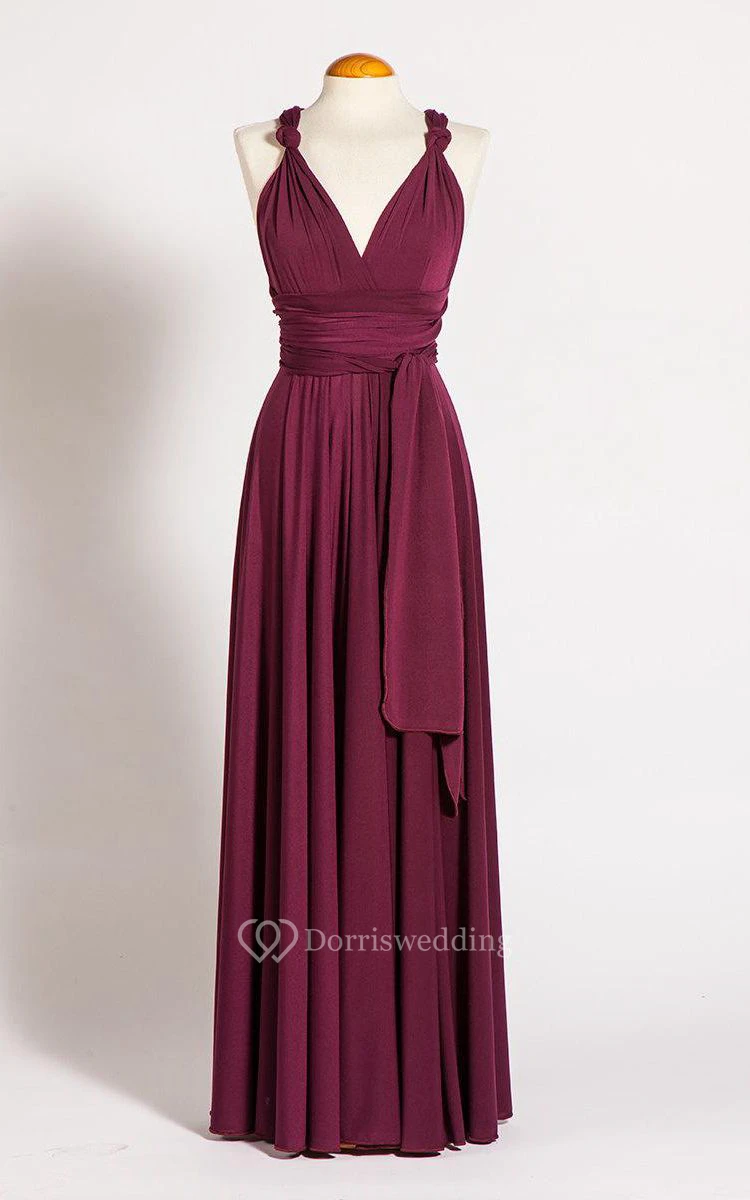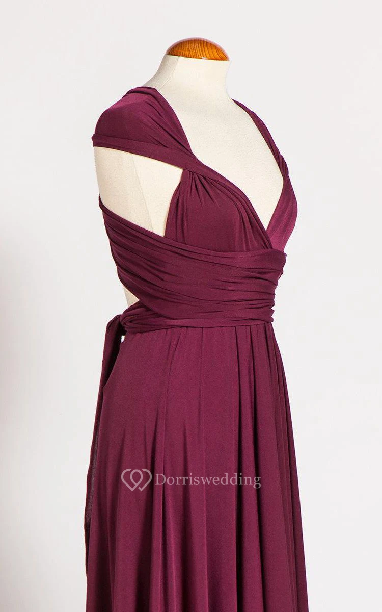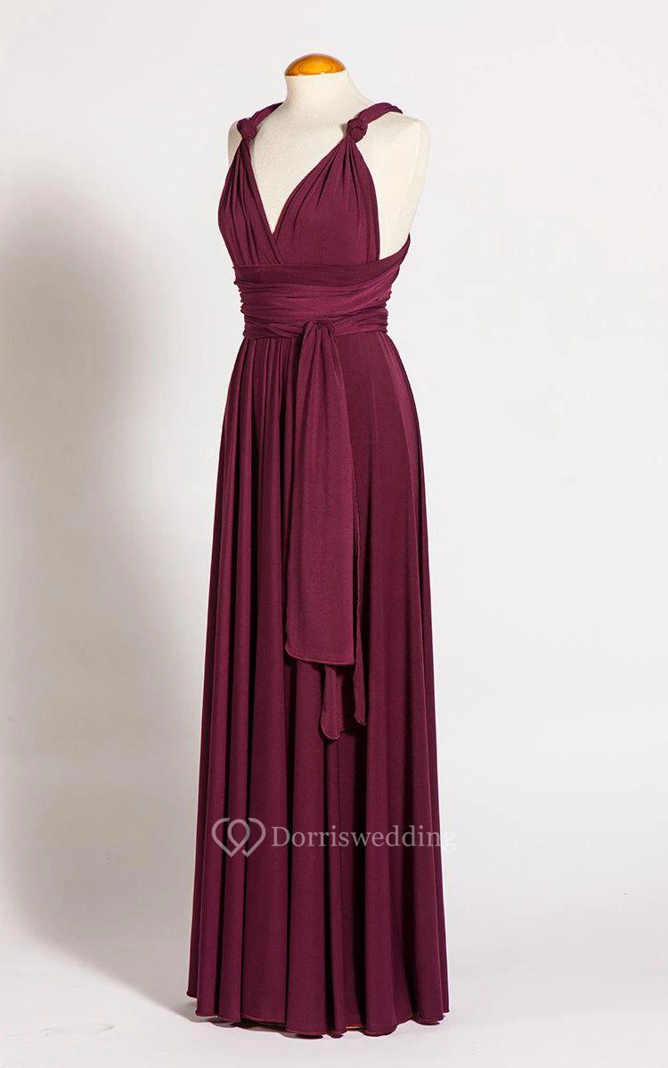 V Neck Sleeveless Empire Pleated A-line Jersey Long Dress With Bandage
