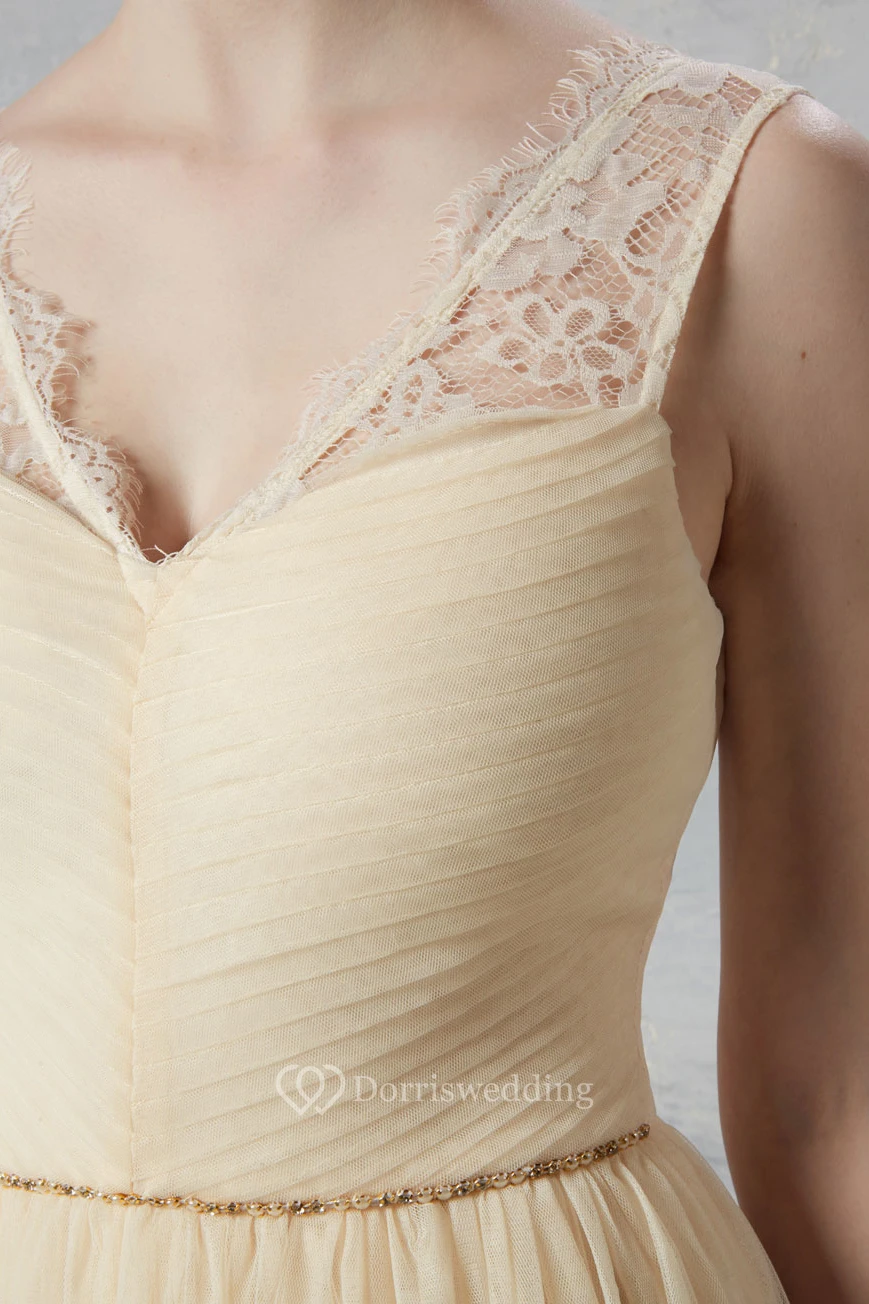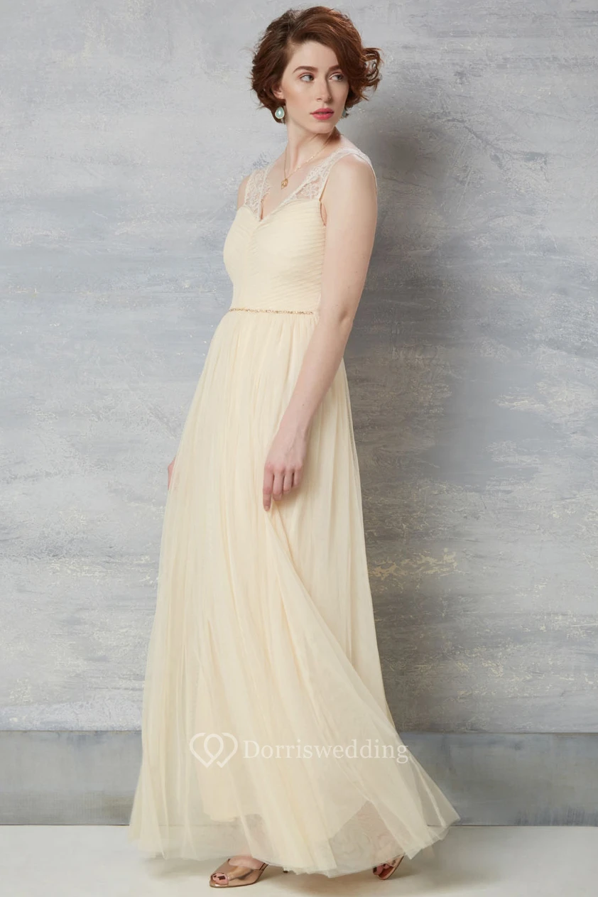 V-Neck Sleeveless Floor-Length Ruched Chiffon Wedding Dress With Lace And Pleats