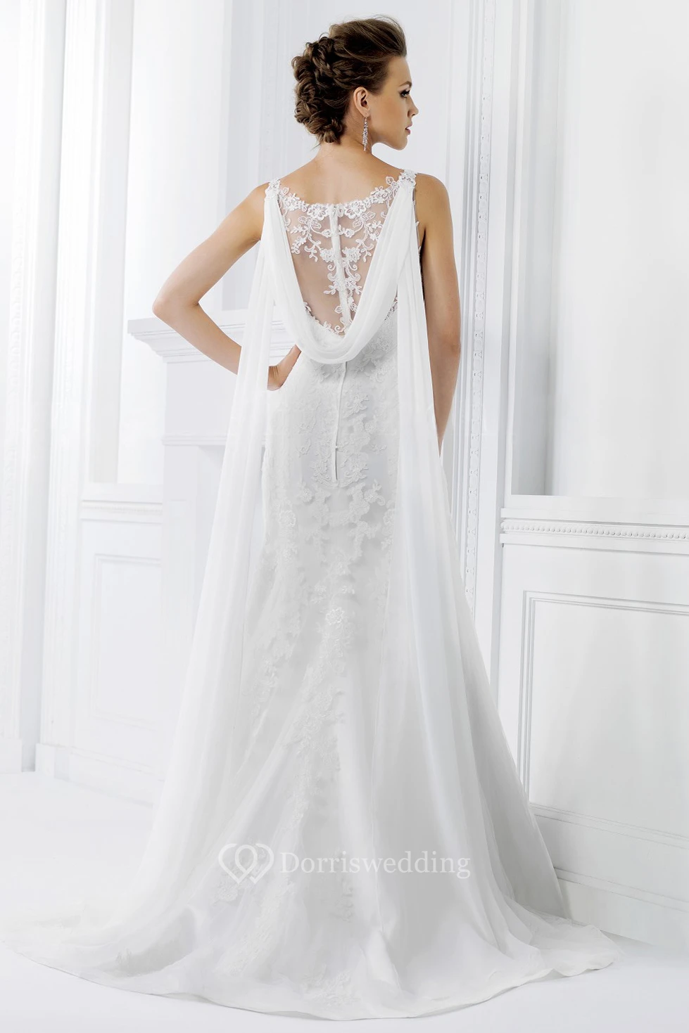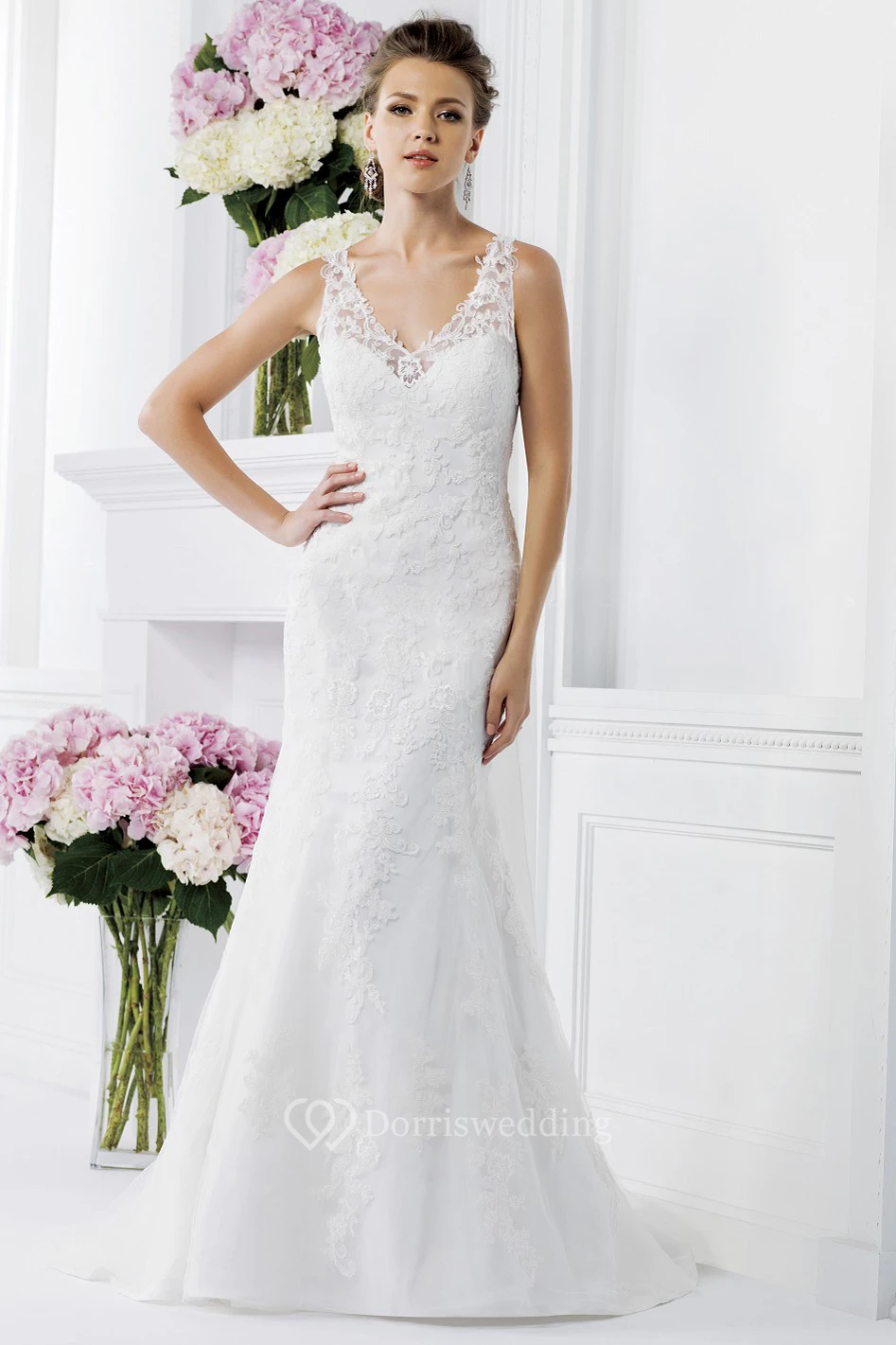V-Neck Sleeveless Lace-Appliqued Wedding Dress With Draping Style