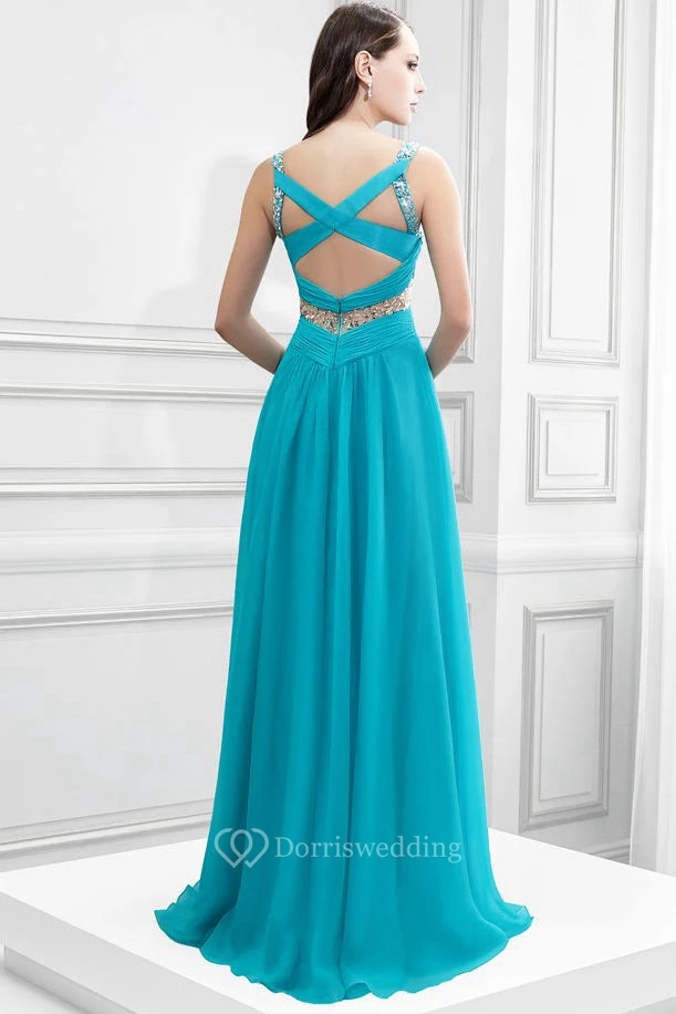 V-Neck Sleeveless Ruched Chiffon Prom Dress With Beading And Brush Train