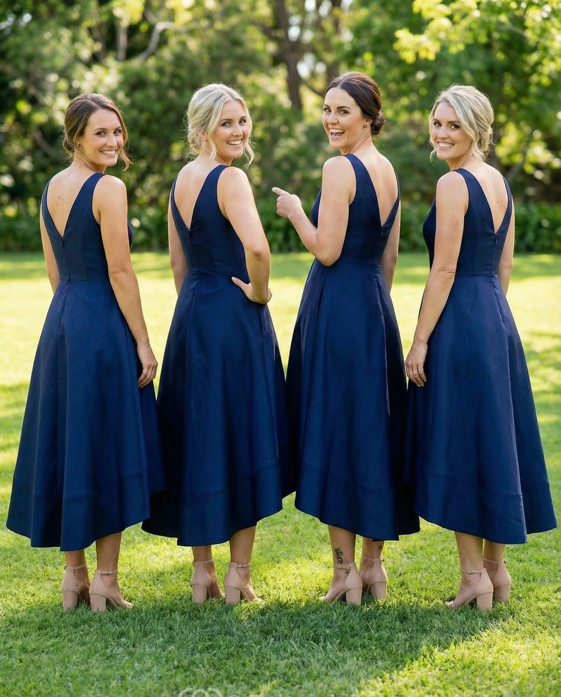 V-Neck Sleeveless Satin A-Line Tea-Length Gown