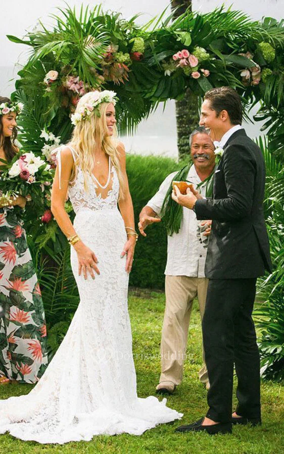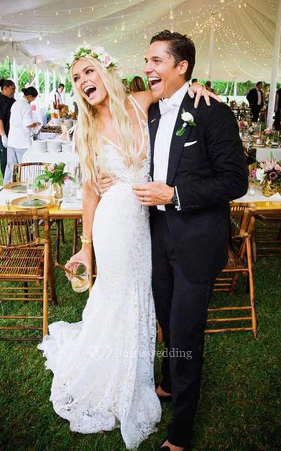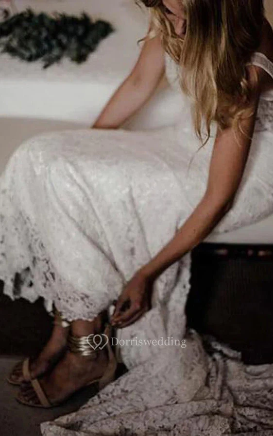 V-neck Sleeveless Sexy Sheath Lace Country Sweep Train Boho Wedding Dress
