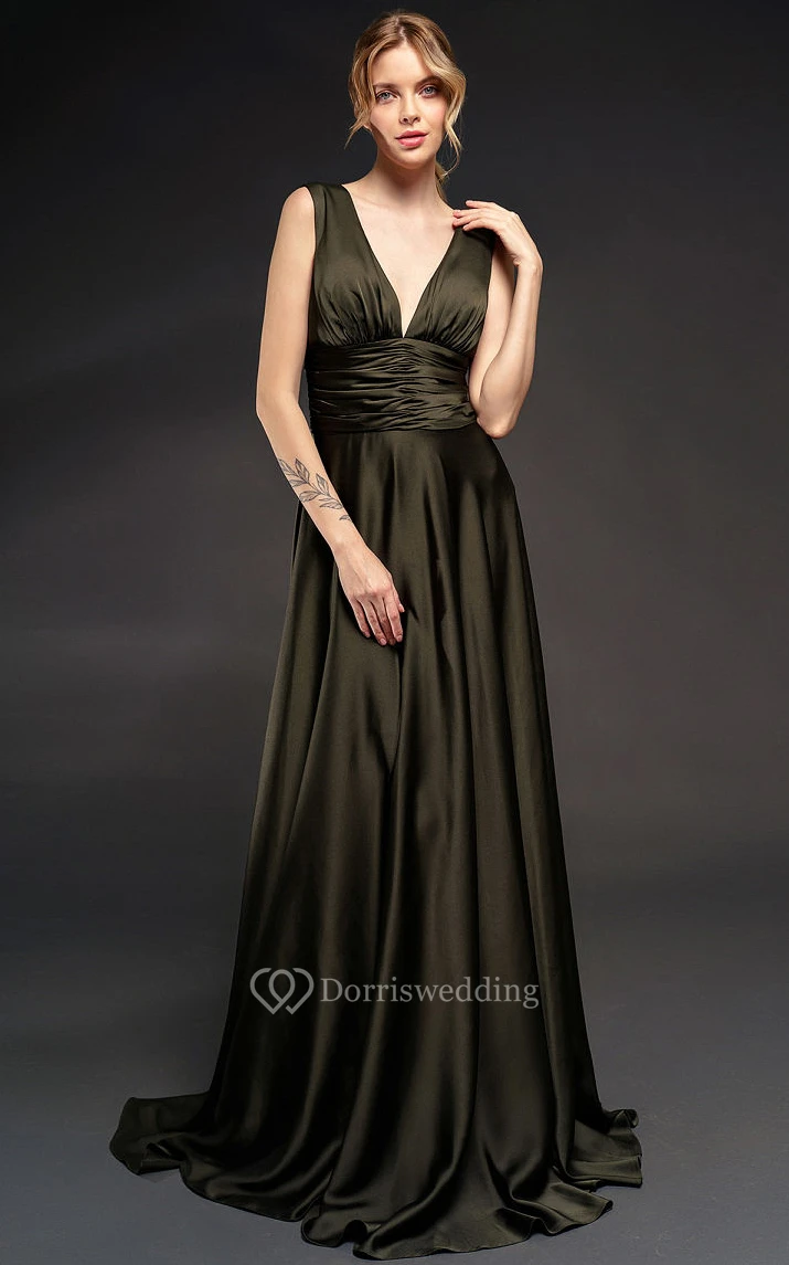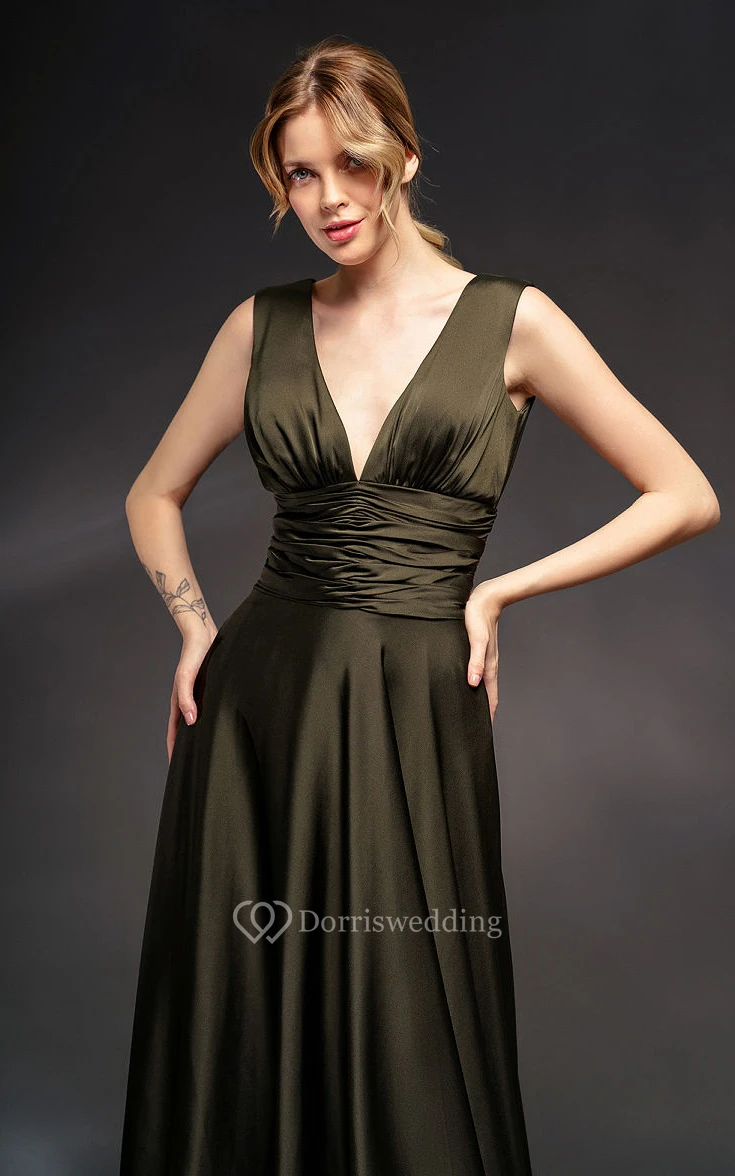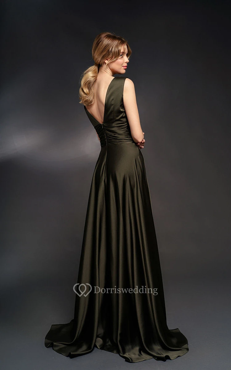 V-neck Sleeveless Sheath Dress with Ruched Waist and Deep-v Back