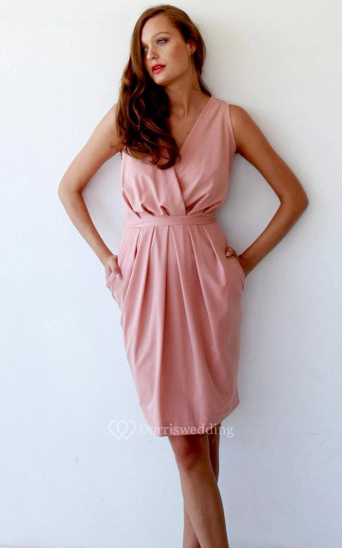 V Neck Sleeveless Sheath Jersey Knee Length Dress With Pleats