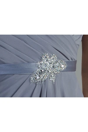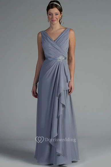 V Neck Sleeveless Side Drape Chiffon Long Mother Of The Bride Dress With Crystal Satin Sash