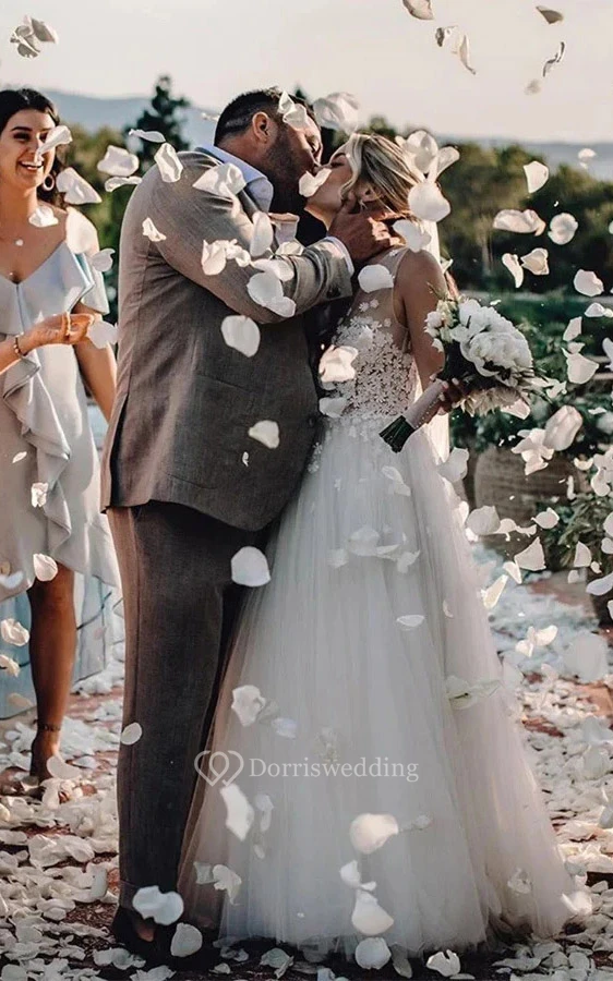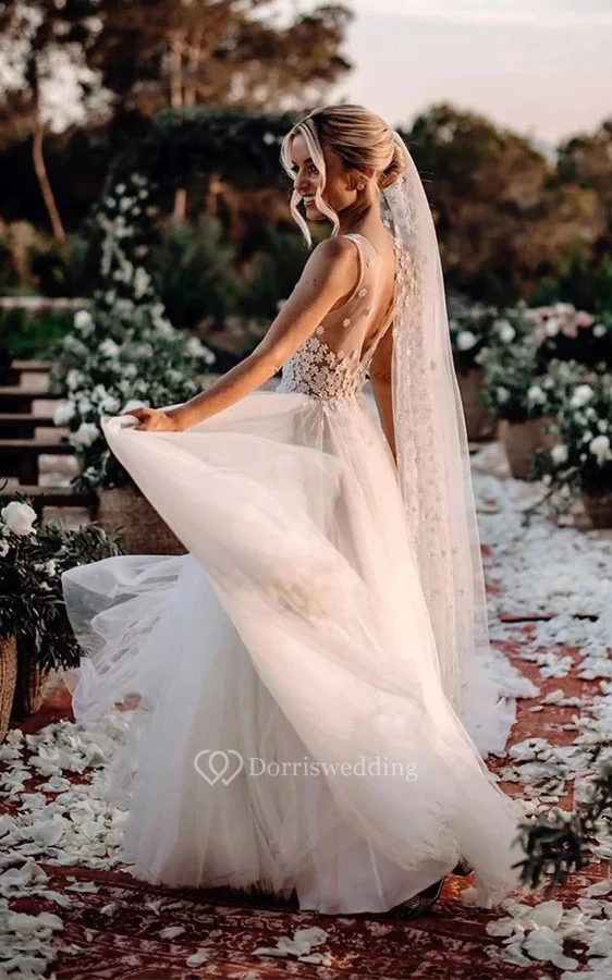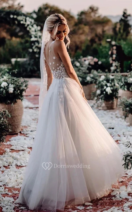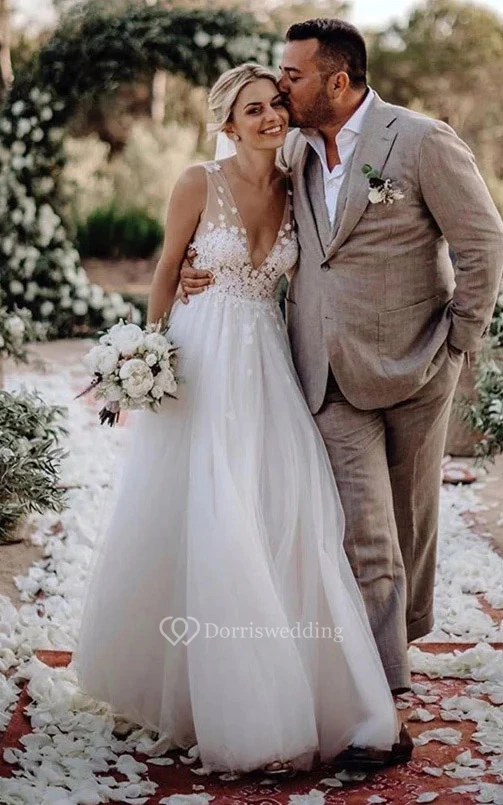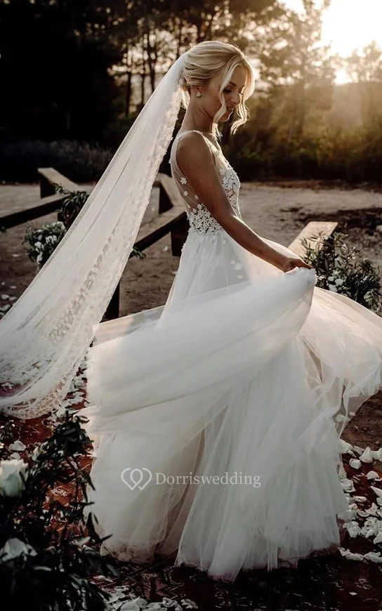 V-neck Sleeveless Tulle A-line Pleated Country Beach Wedding Dress with Lace Top