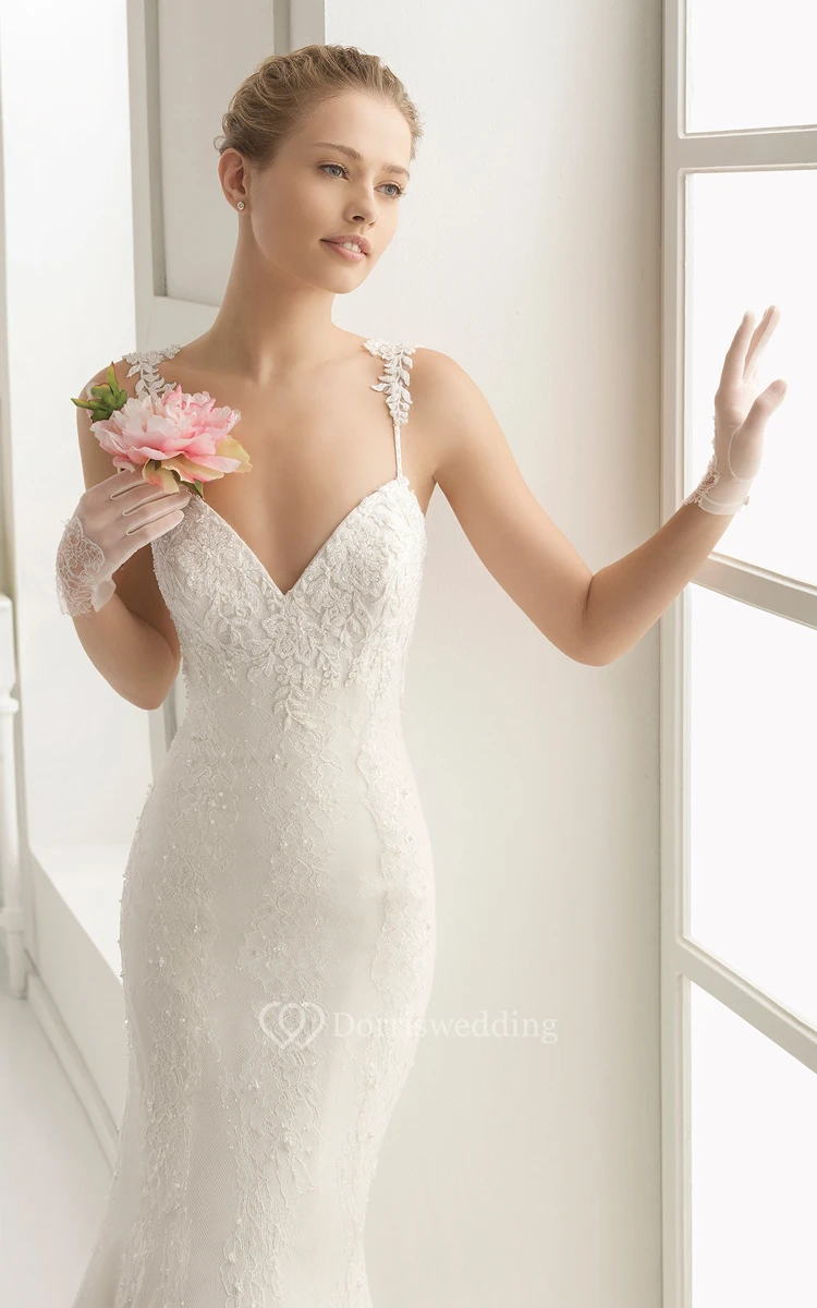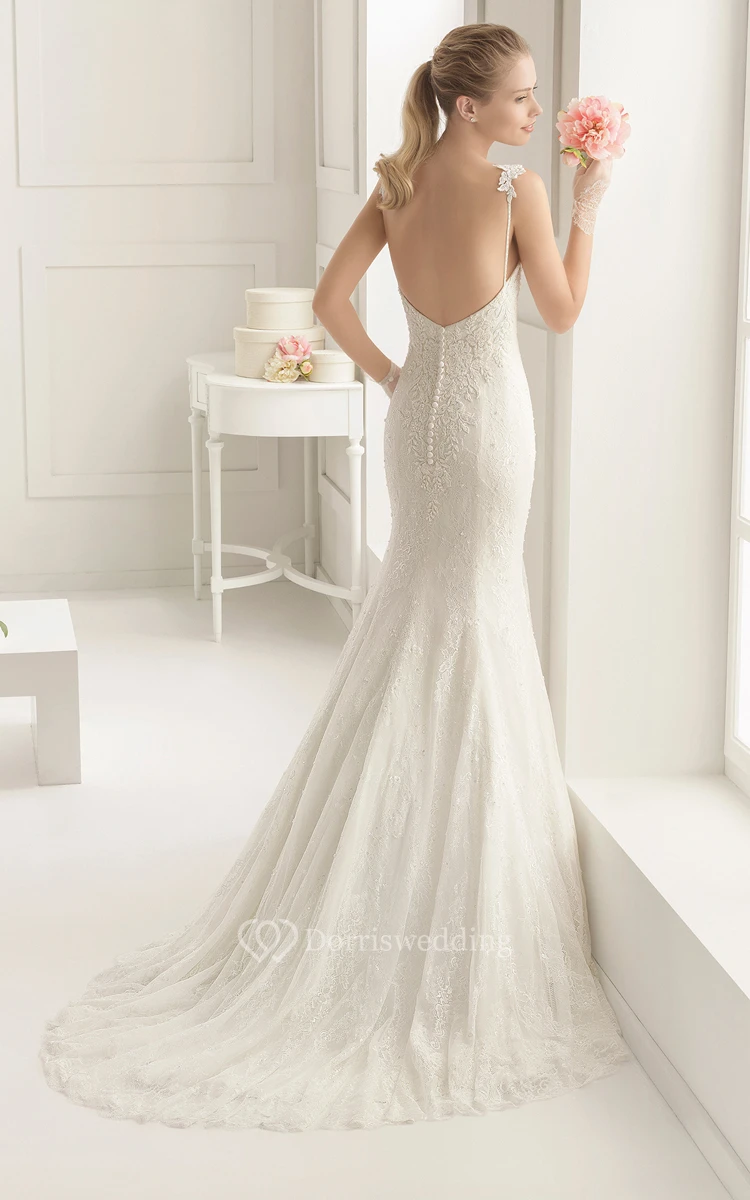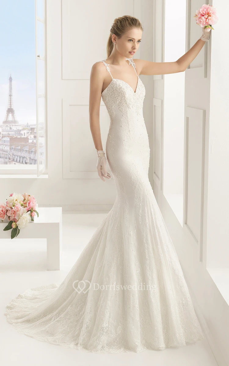 V-Neck Strap Lace Delicate Dress With Court Train